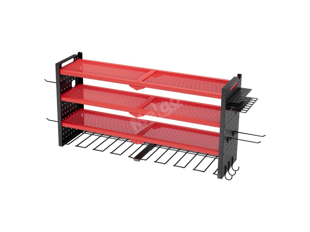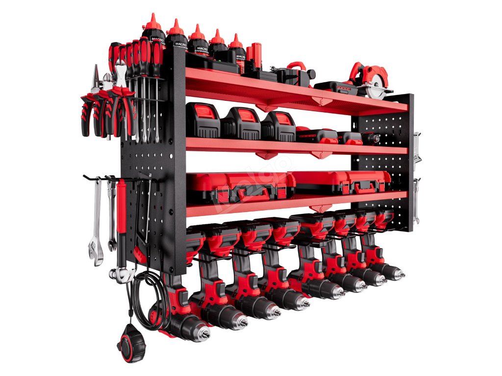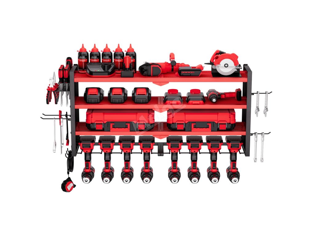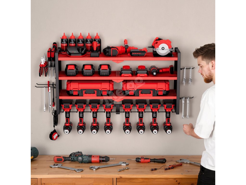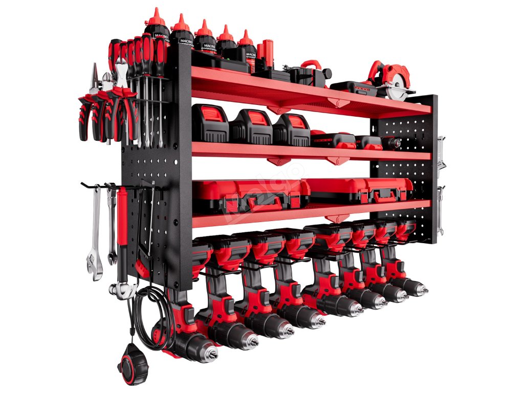 Víceúrovňové uspořádání nástěnného organizéru na nářadí umožňuje snadné uchopení správného nářadí - horní police na baterie a nabíječky, prostřední na boxy s nářadím a díly, spodní otvory na vrtačky nebo kladiva. V bočních háčcích jsou přehledně uloženy kleště, šroubováky, klíče a měřicí pásky.