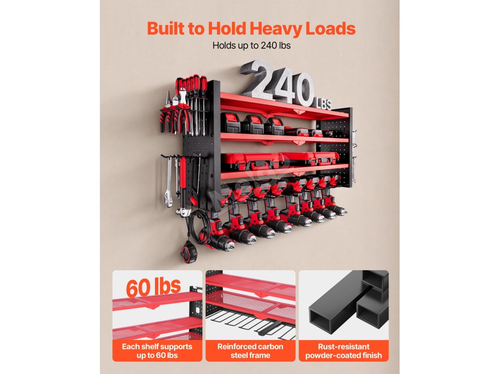 Tento nástěnný čtyřpatrový organizér na elektrické nářadí nabízí rychlý přístup k nářadí. Jeho robustní rám z uhlíkové oceli unese až 240 kg, takže do něj snadno uložíte vrtačky, skříňky s nářadím a další nářadí a získáte uklizený pracovní prostor bez starostí.