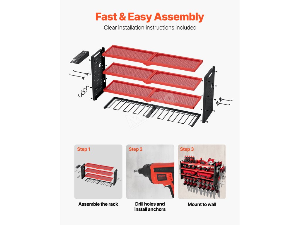 Náš organizér na vrtačku je dodáván s jasným návodem krok za krokem a veškerým potřebným hardwarem, včetně distančního šroubu pro rychlou a snadnou montáž na stěnu. Snadno jej tedy sestavíte během několika minut.