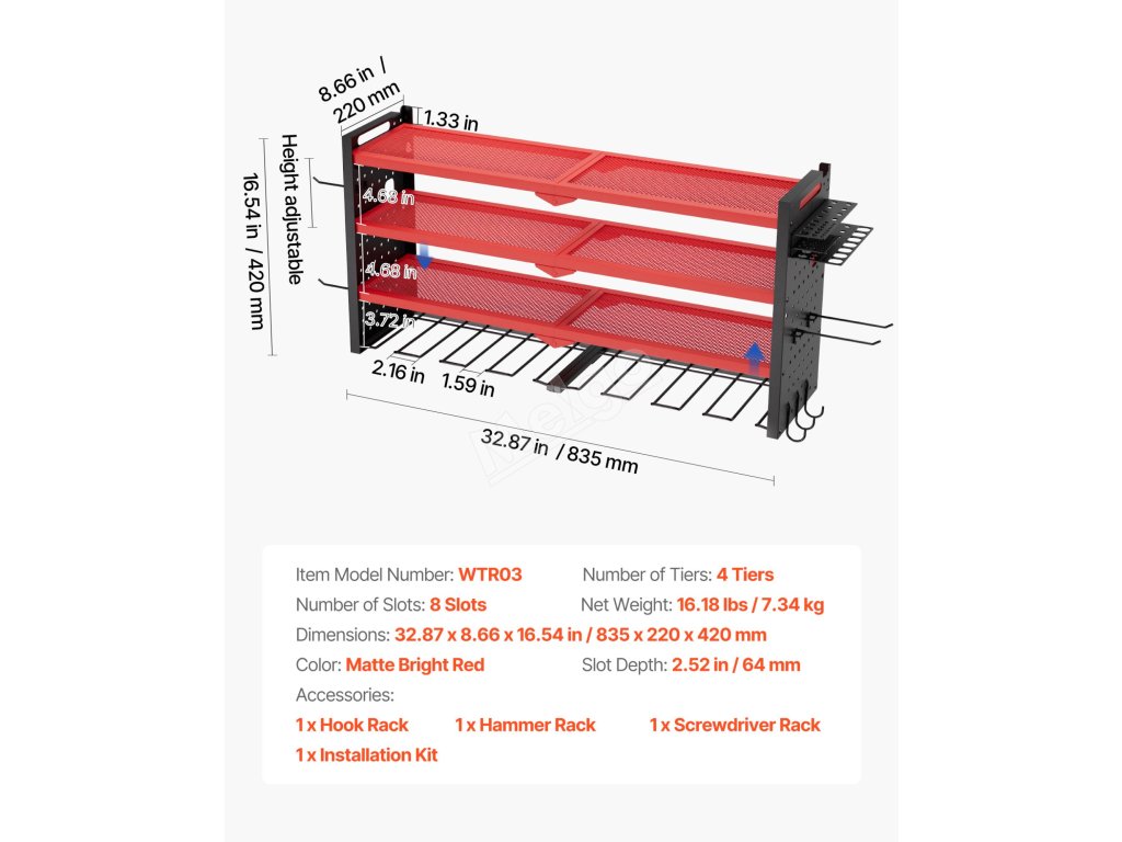 Stěnový organizér nářadí 4 vrstvy 8 držáků na vrtačky, boční panely