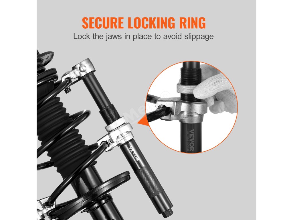 Čelisti s pojistným kroužkem zajišťují bezpečné umístění a nastavitelné bezpečnostní držáky zajišťují rovnoměrné stlačení na obou stranách. Naše sada pro stlačování pružin tlumičů vám umožní bezpečně demontovat a opětovně montovat pružiny různých velikostí s vědomím, že vaše bezpečnost je zaručena.