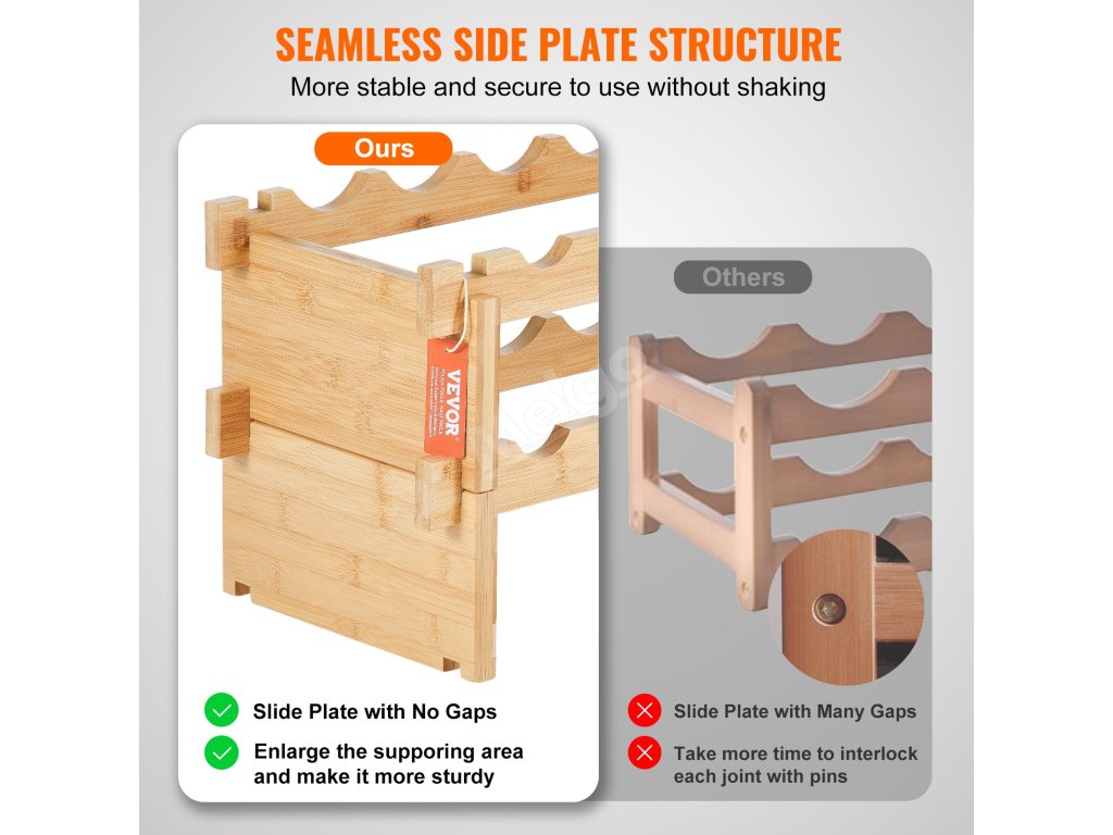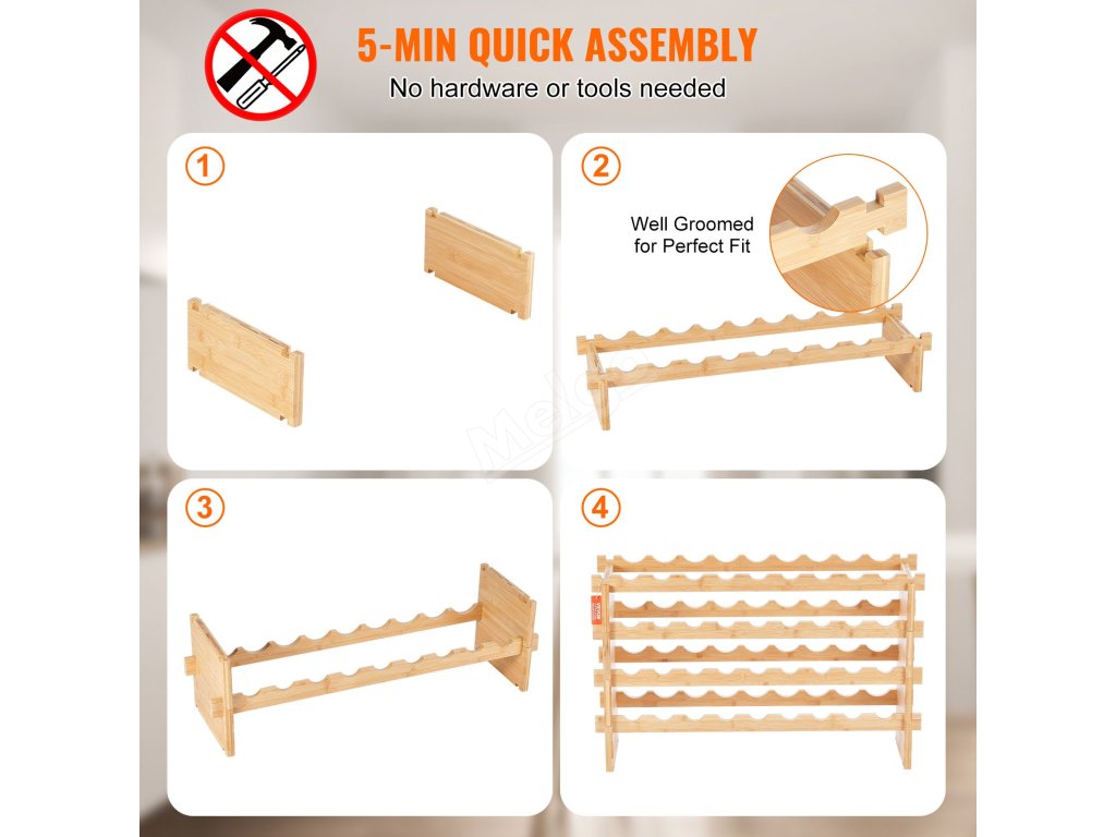 Instalace našeho bambusového stojanu na víno je rychlá a snadná, zabere jen 5 minut a nevyžaduje žádné nářadí ani hardware. Můžete jej také poskládat do vámi zvoleného počtu vrstev.