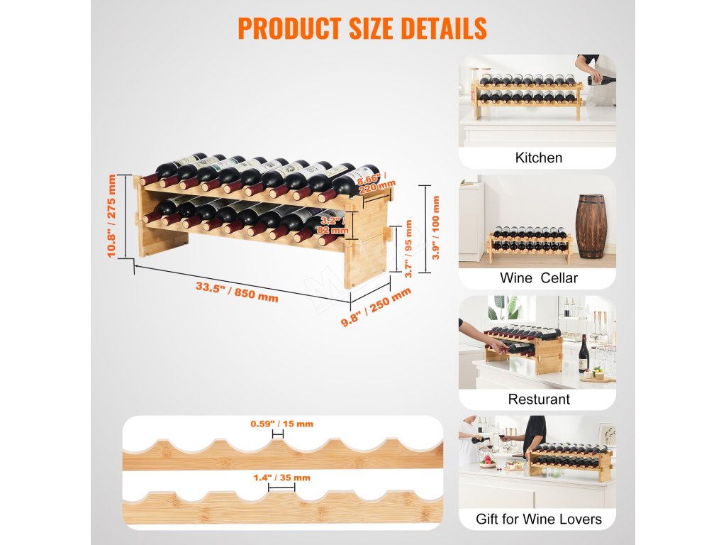 Tento stojan na víno měří přibližně 33,5 × 9,8 × 10,8 palce (850 × 250 × 275 mm) a pojme až 18 lahví (2 úrovně, 9 lahví na úroveň).