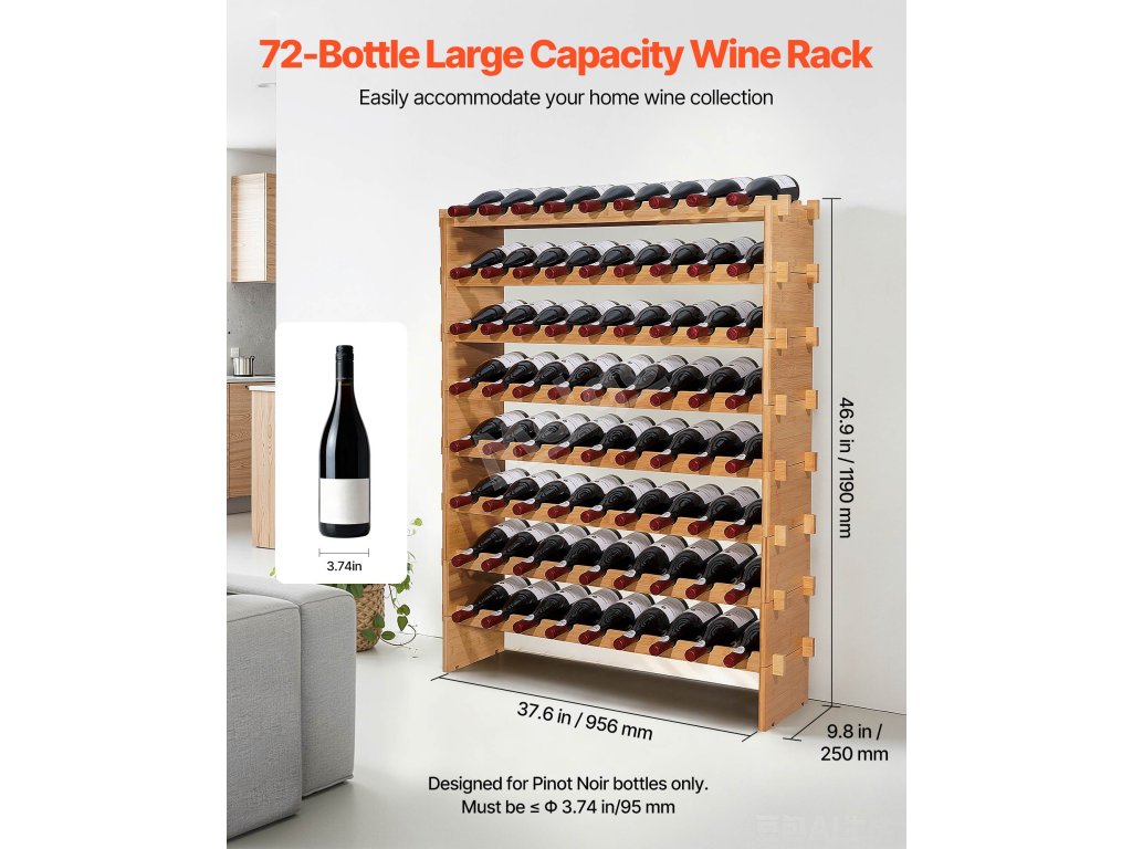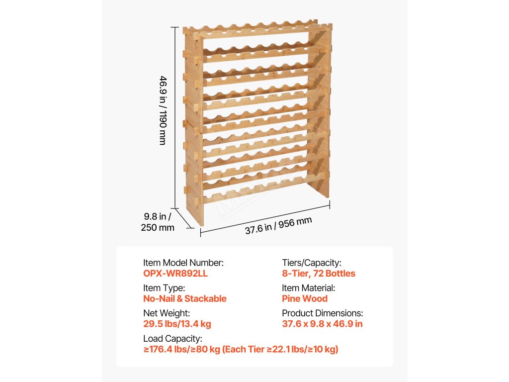 Stojací modulární regál na víno 72 lahví, 8 úrovní, stohovatelný