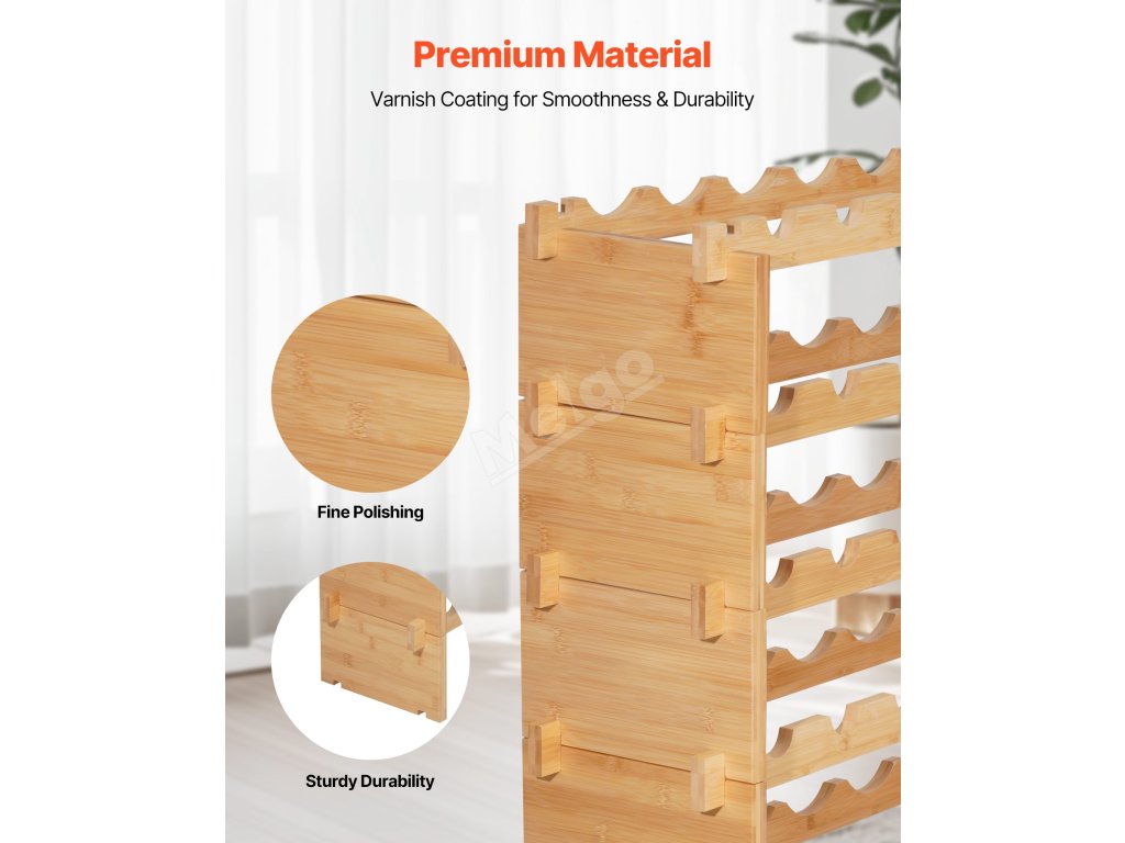 Náš regál do vinotéky je dodáván s podrobným návodem k rychlé montáži - není třeba žádné další nářadí ani šrouby. Stojan jednoduše zarovnejte zářezy a drážky a stisknutím jej sestavte. Montáž zvládnou během několika minut i začátečníci.