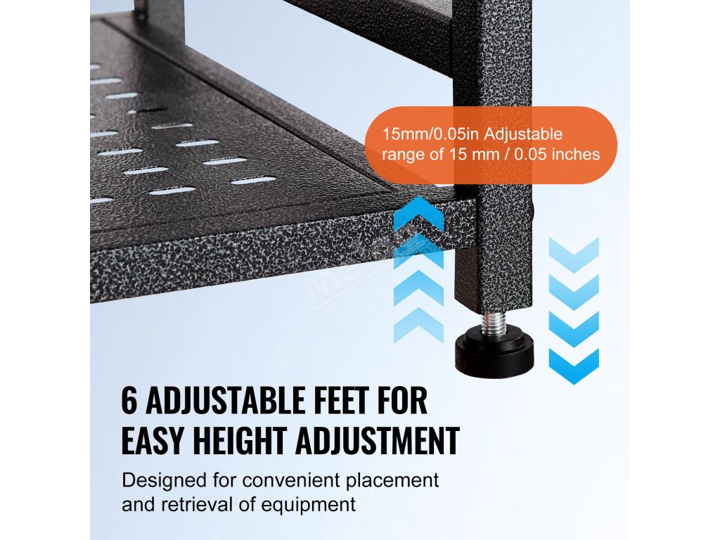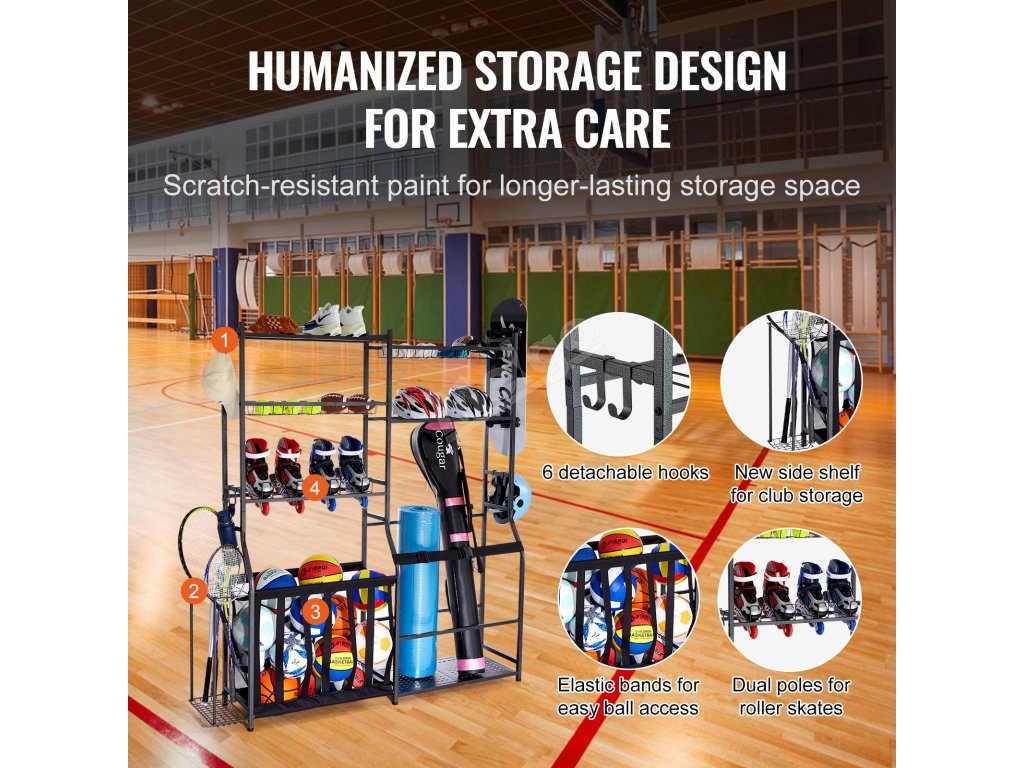 Vyjímatelné háčky rozšiřují úložný prostor a možnosti; přidaný boční stojan usnadňuje umístění různých raket a pálky. Pružné pásky maximalizují využití úložného prostoru pro míče. Sportovní úložný vozík je vybaven šesti nastavitelnými nožičkami pro snadné nastavení výšky.