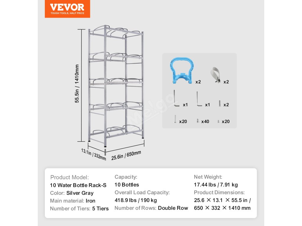 Tento vertikální stojan na láhve s vodou pojme 10 lahví a unese až 418,9 kg. Nastavitelné otvory pojmou třígalonové i pětilitrové kbelíky a hodí se k různým dávkovačům vody.