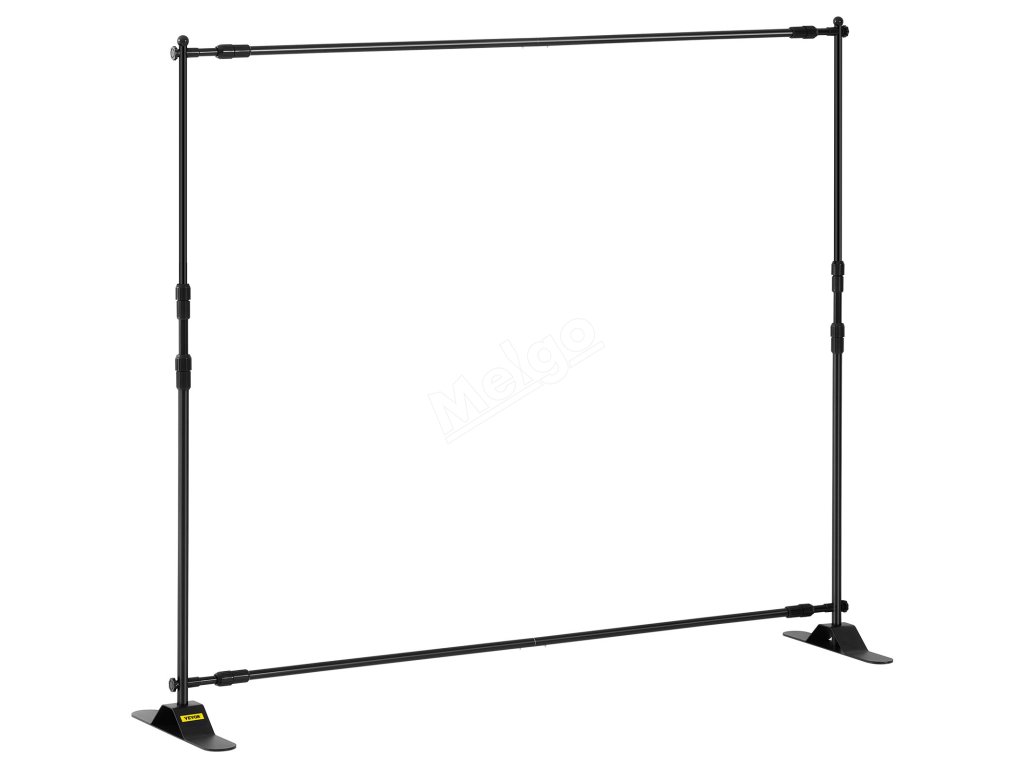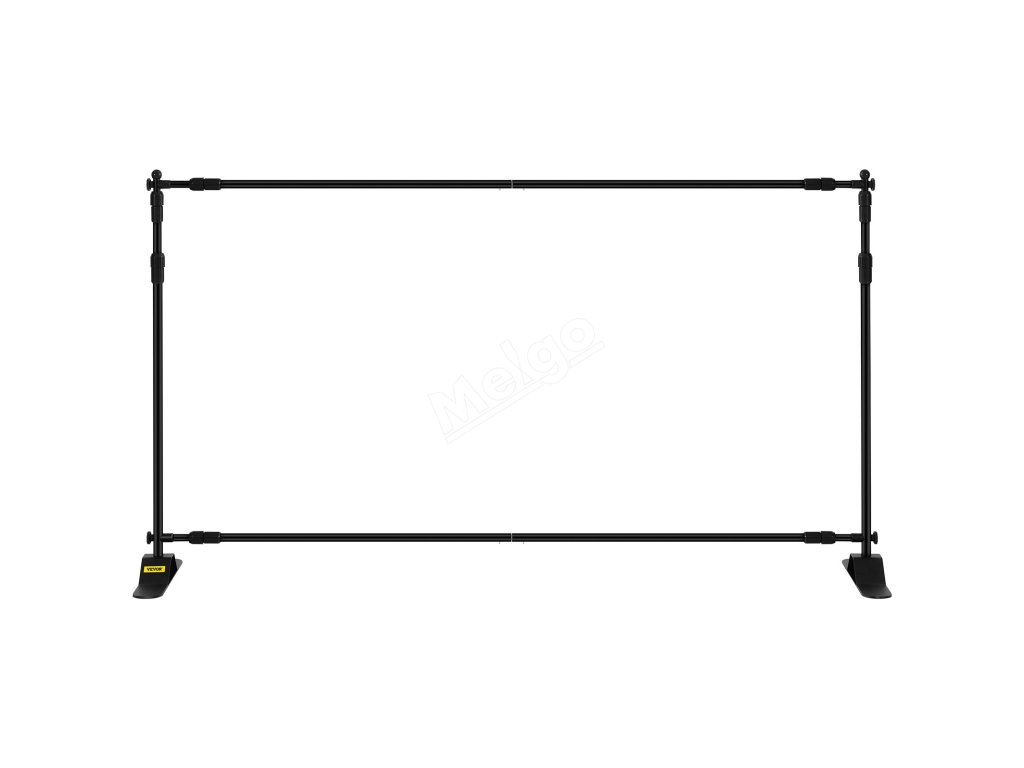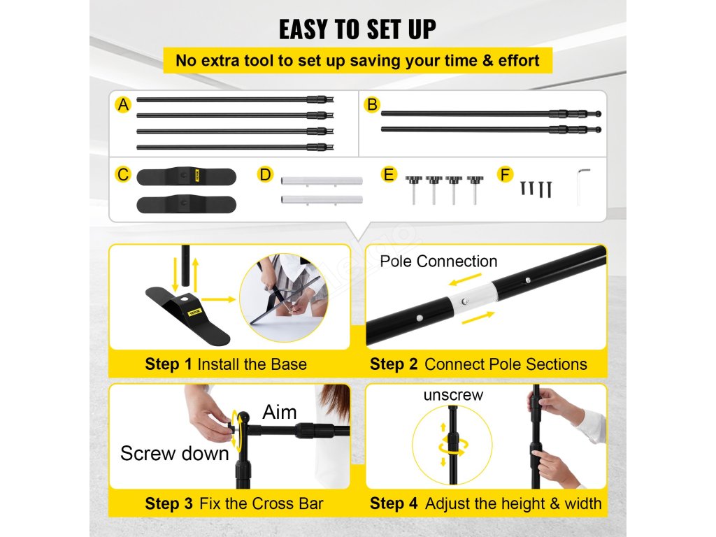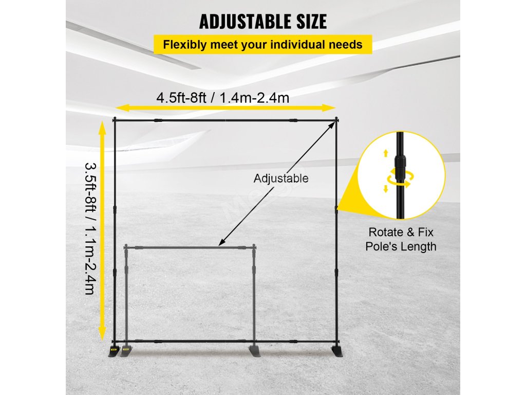 Tento rám pozadí je nastavitelný na šířku a výšku otáčením tyčí na místě. Podporuje libovolnou velikost banneru od 3,5 ft x 4,5 ft / 1,1 m x 1,4 m do 4,5 ft x 8 ft / 1,4 m x 2,4 m.
