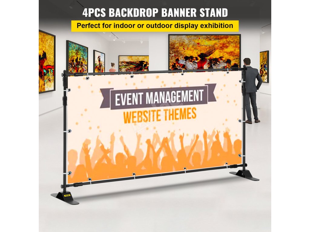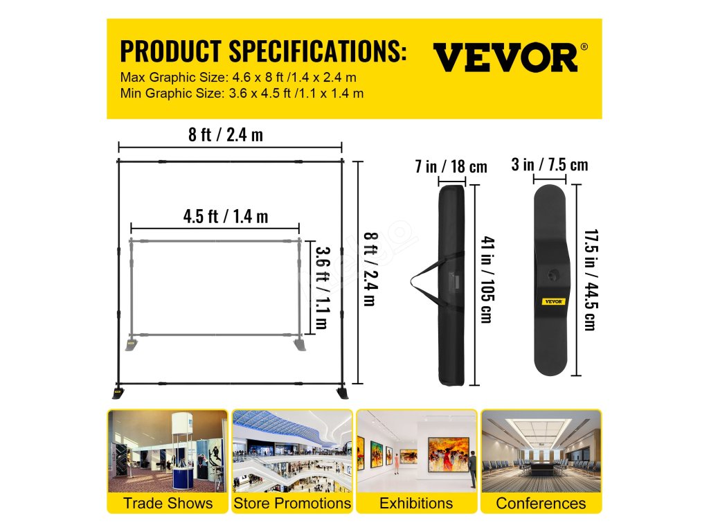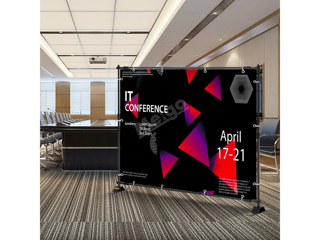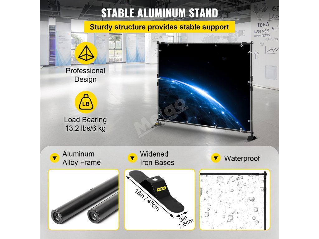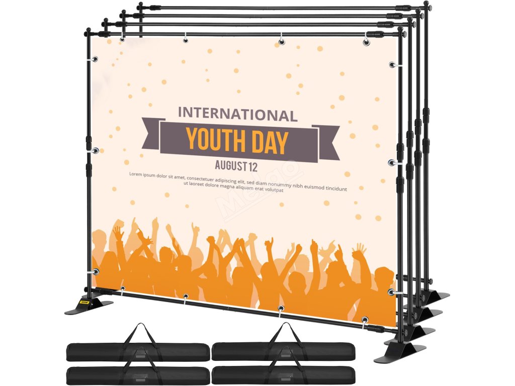 Tento rám pozadí je nastavitelný na šířku a výšku otáčením tyčí na místě. Podporuje libovolnou velikost banneru od 3,5 ft x 4,5 ft / 1,1 m x 1,4 m do 4,5 ft x 8 ft / 1,4 m x 2,4 m.