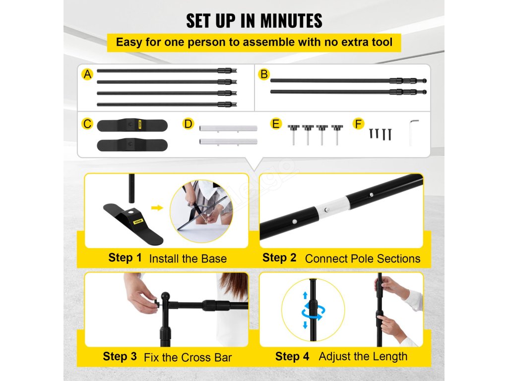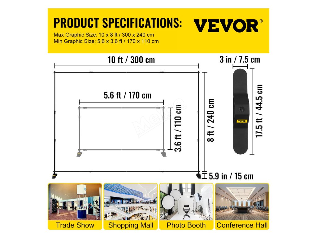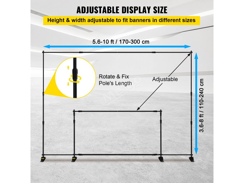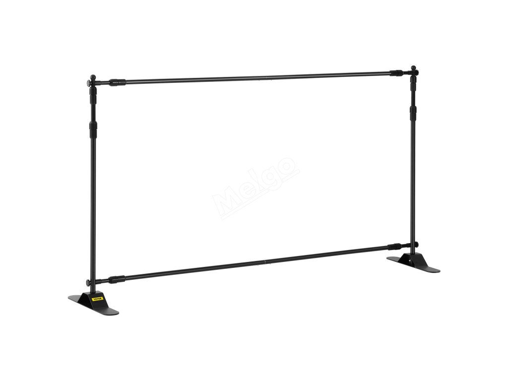 Tento rám pozadí je nastavitelný na šířku a výšku otáčením tyčí na místě. Udrží jakoukoli velikost banneru od 5,6 x 3,6 stop/170 x 110 cm do 10 x 8 stop/300 x 240 cm.