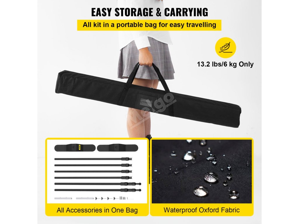 Celá sada je zabalena v přenosné tašce, která šetří místo při skladování a častém cestování. S hmotností 13,2 lbs/6 kg lze stojan na párty pozadí snadno přenášet kamkoli.