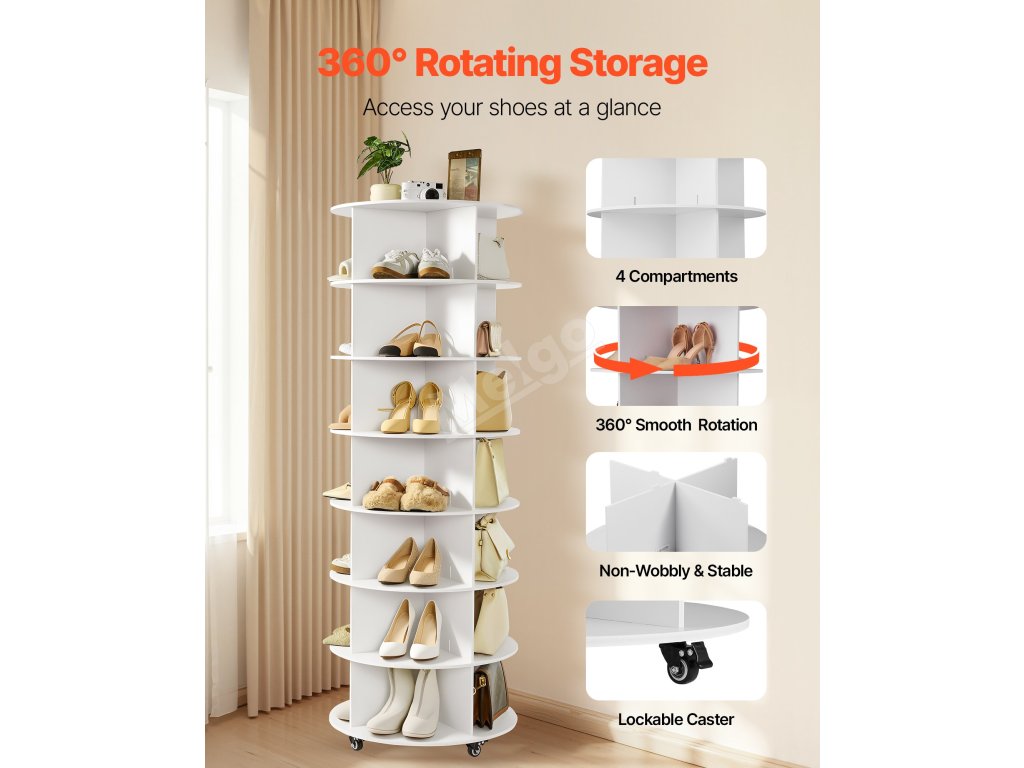 Tento otočný stojan na boty je vybaven 360° otočnou základnou a umožňuje snadný přehled a dosah na boty a tašky. Díky 4 přihrádkám pojme více než 28 párů bot. Jeho vnitřní výška 21 cm je vhodná pro kožené boty, tenisky a podpatky - udržuje malé prostory přehledné a organizované.