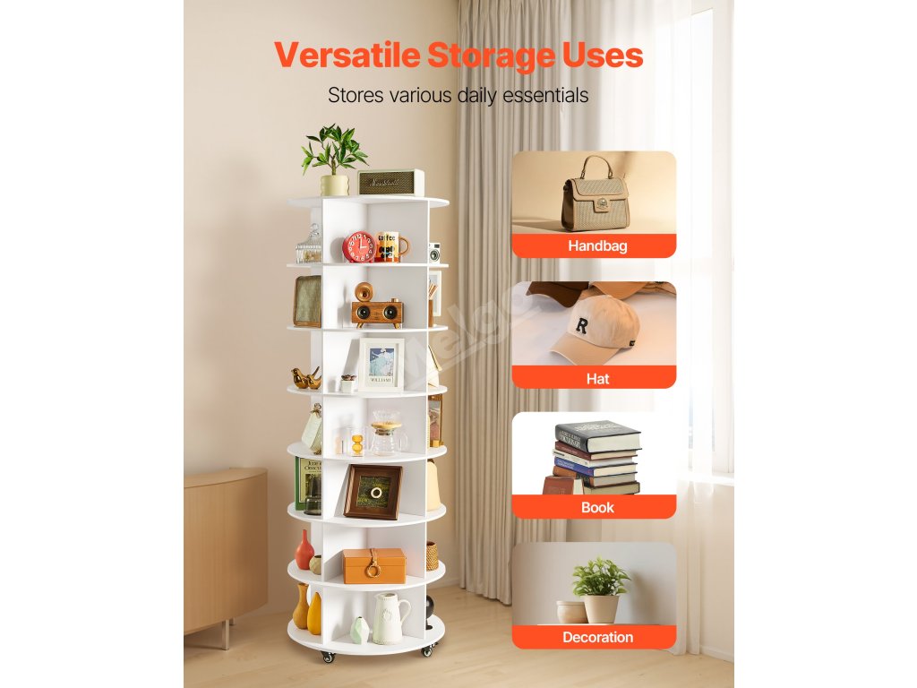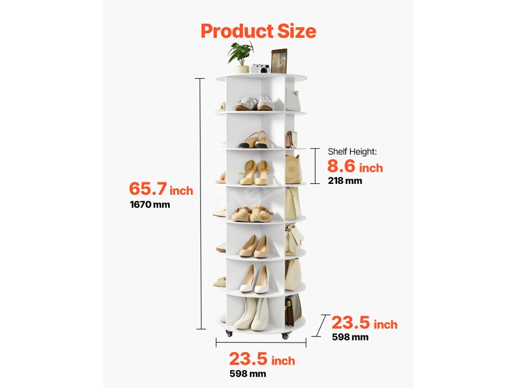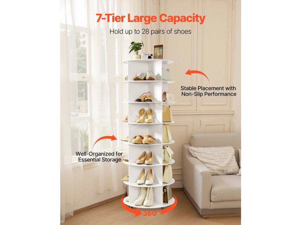 Tento sedmivrstvý otočný botník s válcovým designem má 4 přihrádky pro každou vrstvu. Boty lze vertikálně třídit podle ročního období, člena rodiny nebo frekvence používání. Při úplném otočení jsou všechny páry vystaveny najednou, aniž by se ohýbaly. Zabírá pouze jednu dlaždici, čímž udržuje váš prostor čistý a uklizený.