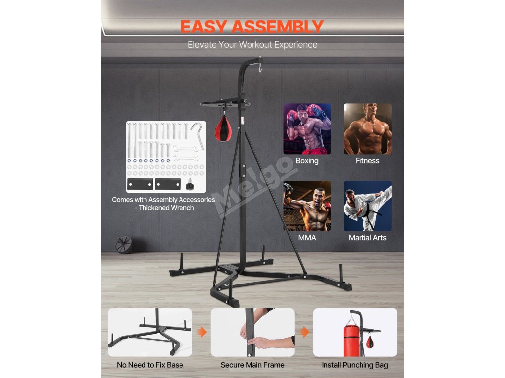 Stojan na pytle s pískem není nutné připevňovat k podlaze, stačí upevnit hlavní rám a nainstalovat boxovací pytel. S naším návodem lze stojan sestavit během několika minut. Montážní nářadí je součástí balení a i samostatnou instalaci ženami lze provést rychle.
