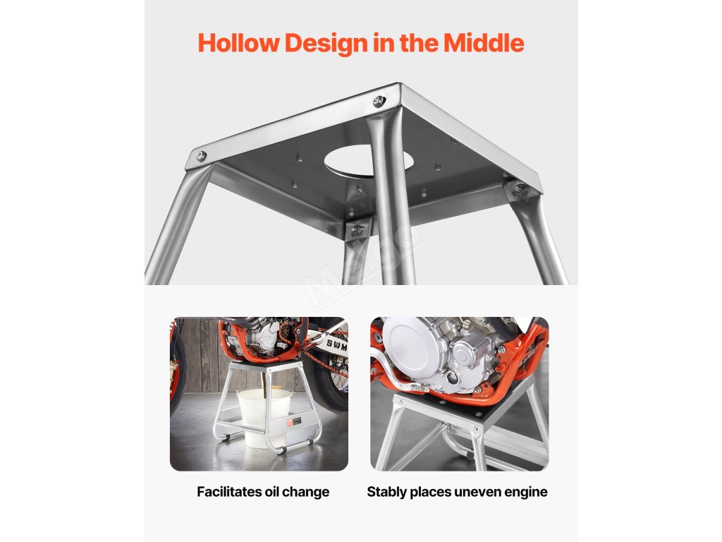 Náš stojan na čtyřkolky má dutou konstrukci, která je ideální pro výměnu oleje a bezpečně podpírá motory různých tvarů, čímž zabraňuje jejich převrácení.