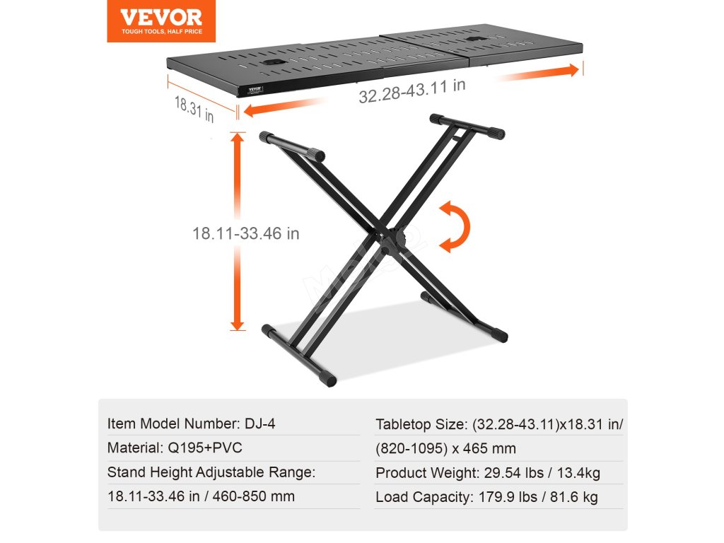DJ stůl má nastavitelnou horní desku o rozměrech (32"-43") x 18", na kterou se pohodlně vejde DJ vybavení. Jeho síťovaná konstrukce zlepšuje odvod tepla, udržuje vaši sestavu organizovanou a vizuálně přitažlivou pro vaše publikum.