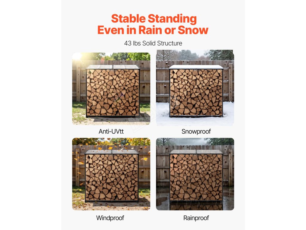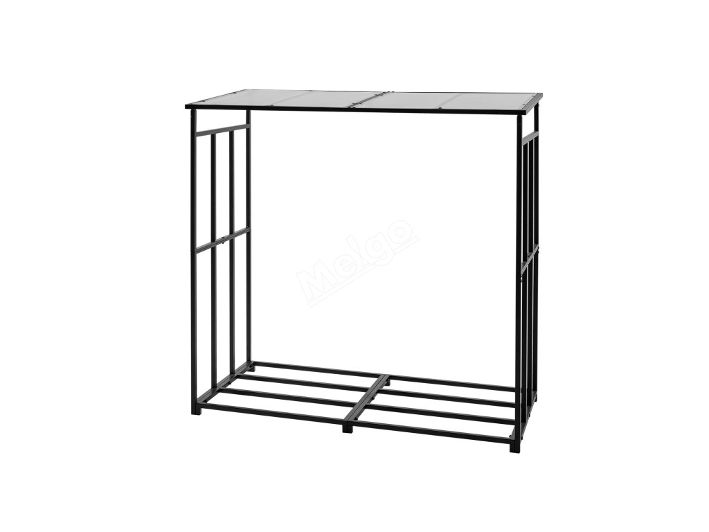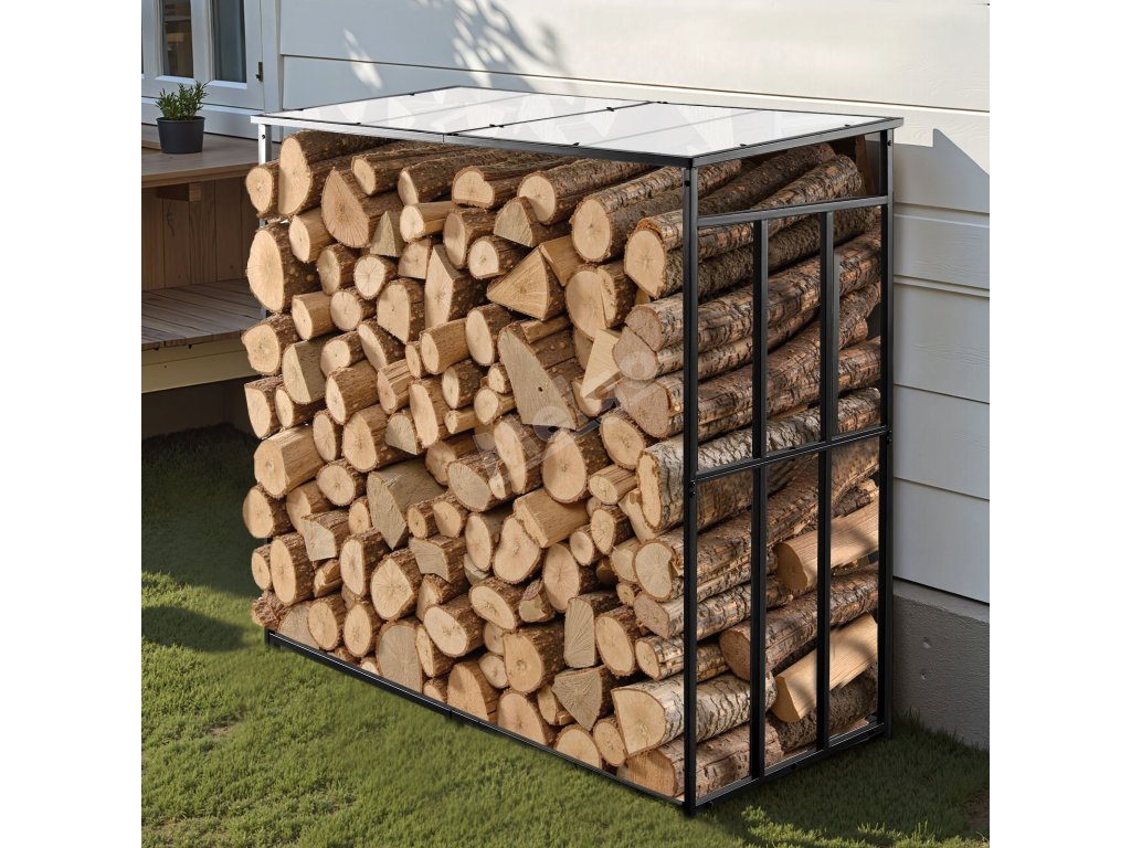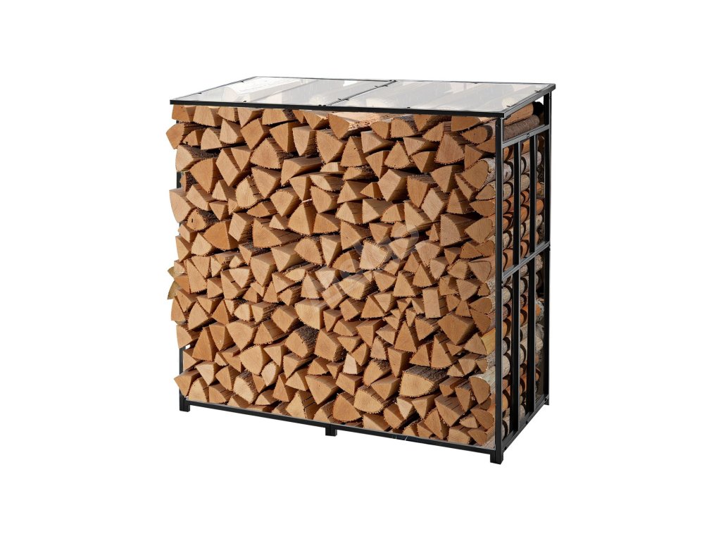 Tento robustní stojan je vyroben z pozinkované oceli a hliníku s práškovou povrchovou úpravou odolnou proti korozi a pojme až 1/4 šňůry dřeva ve dvou řadách. Polykarbonátová stříška chrání palivové dřevo před deštěm a sněhem. Je vybaven nastavitelnými nožičkami pro nerovný terén a volně stojící konstrukcí - ideální pro zasněžené dvory.