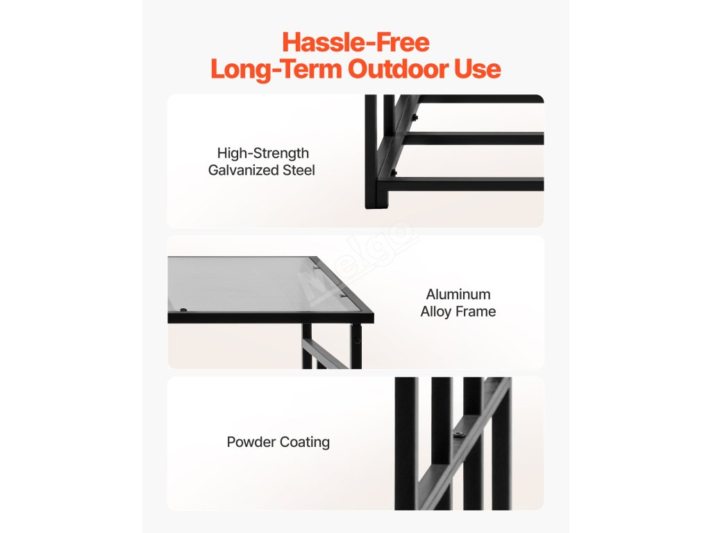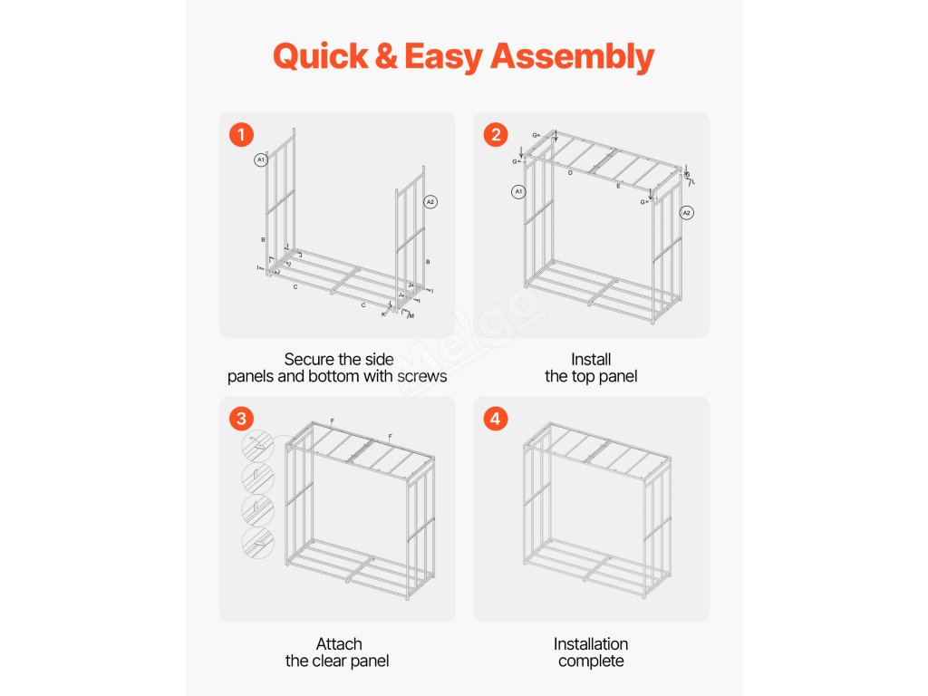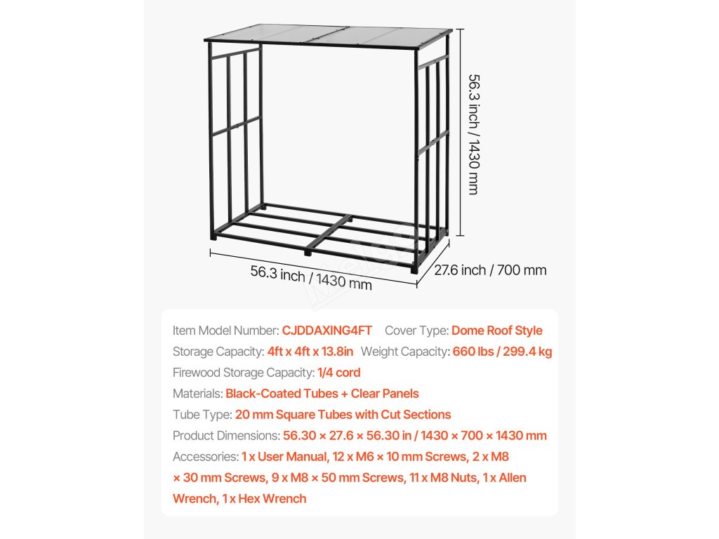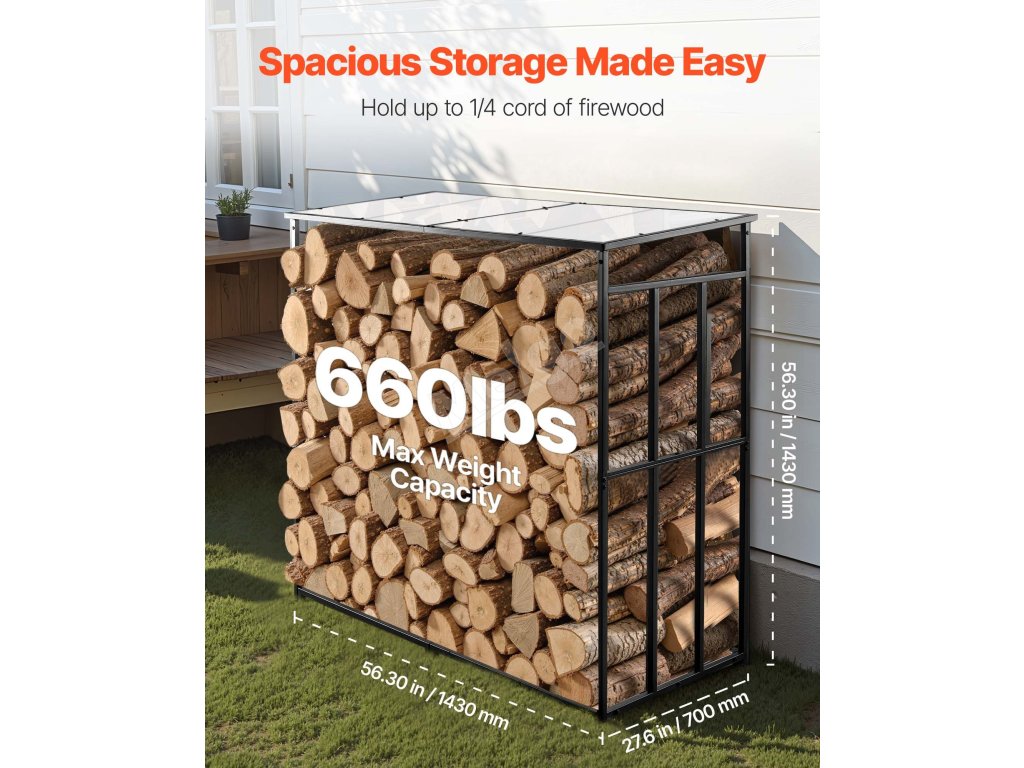 Tento robustní stojan je vyroben z pozinkované oceli a hliníku s práškovou povrchovou úpravou odolnou proti korozi a pojme až 1/4 šňůry dřeva ve dvou řadách. Polykarbonátová stříška chrání palivové dřevo před deštěm a sněhem. Je vybaven nastavitelnými nožičkami pro nerovný terén a volně stojící konstrukcí - ideální pro zasněžené dvory.