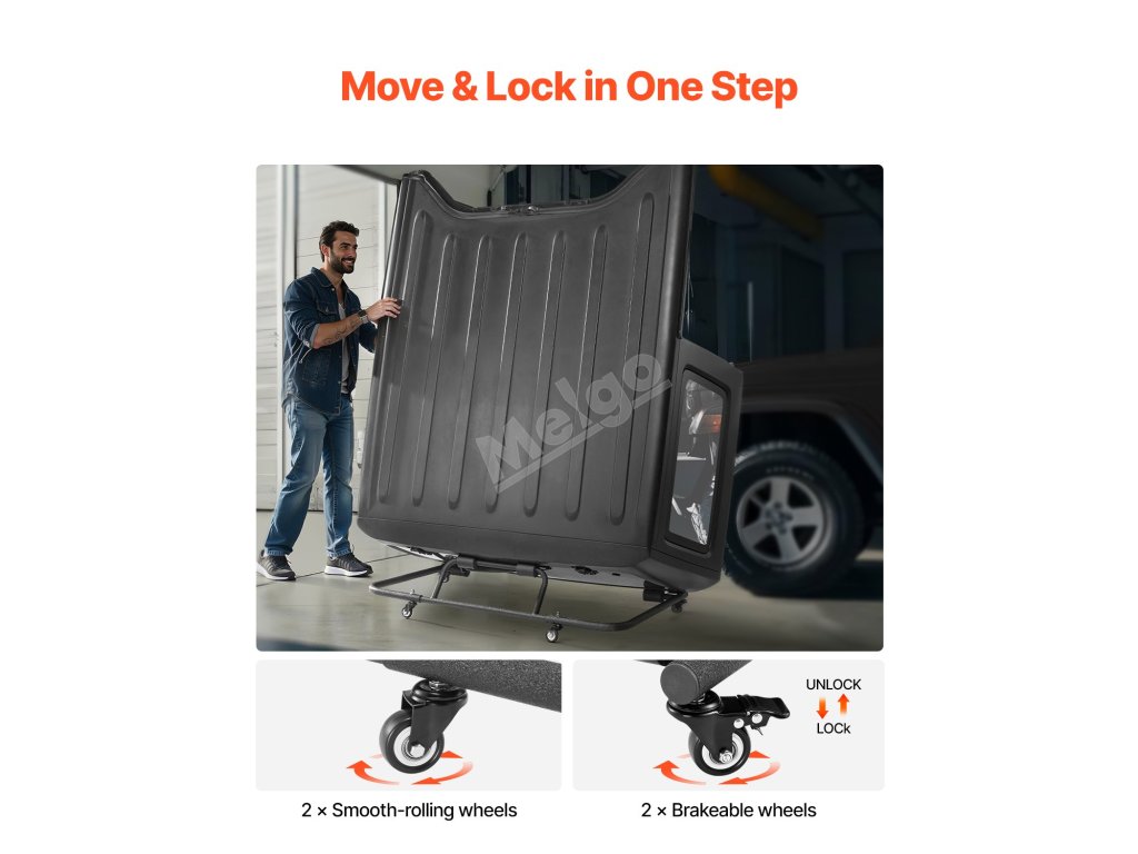 Regál je vybaven 2 pohyblivými kolečky a 2 kolečky s brzdou, takže se může snadno pohybovat po garáži nebo skladu, i když je plně naložený. Funkce brzdy zajišťuje bezpečné umístění v případě potřeby a zároveň se snadno ovládá.