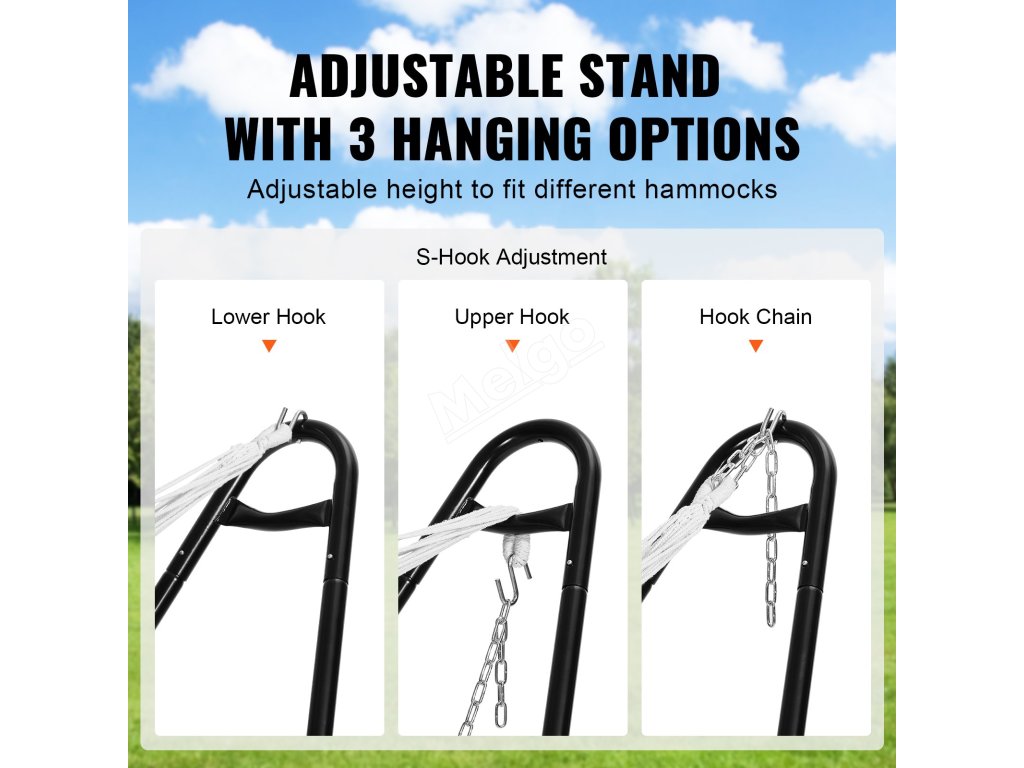 Tři možnosti nastavení umožňují snadno nastavit výšku rámu houpací sítě tak, aby vyhovovala potřebám různých osob: horní hák, spodní hák a dlouhý řetězový hák. To vám umožní najít pohodlnou výšku a zajistit optimální zážitek při každém použití.