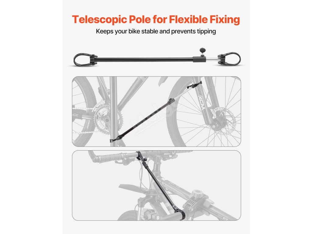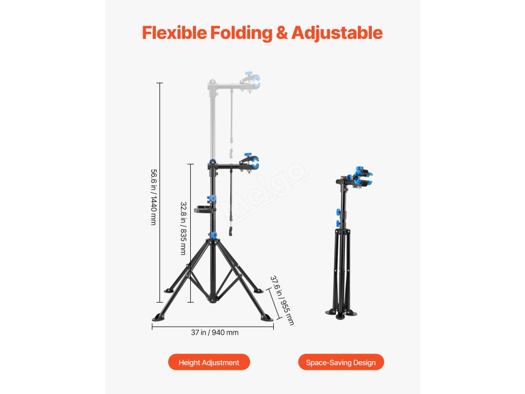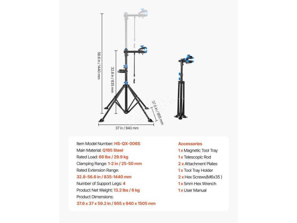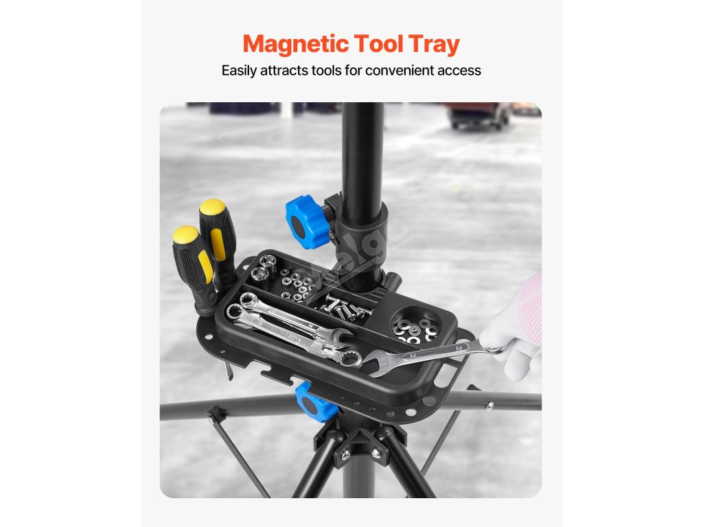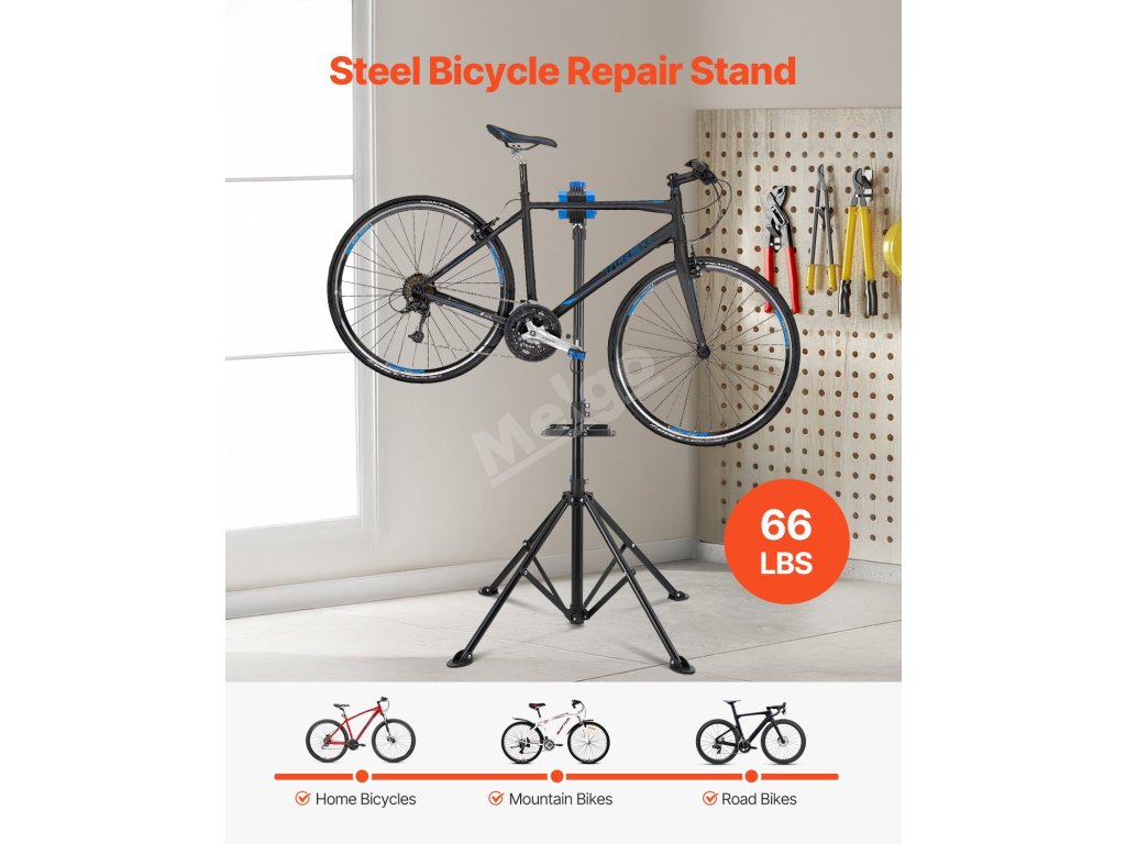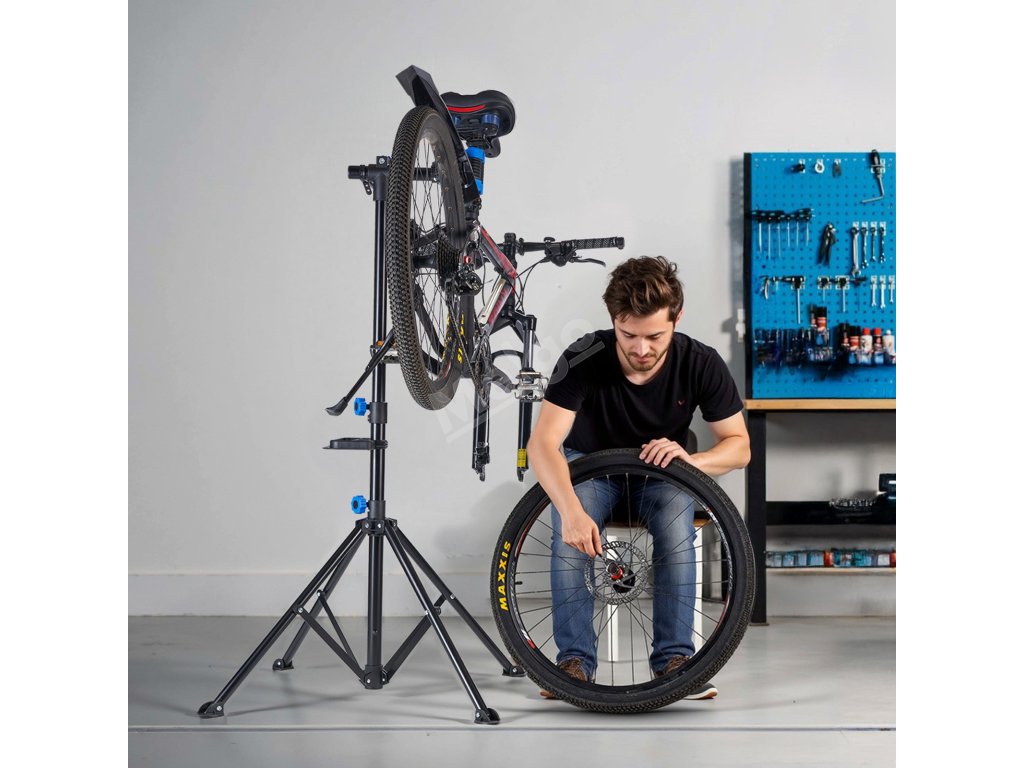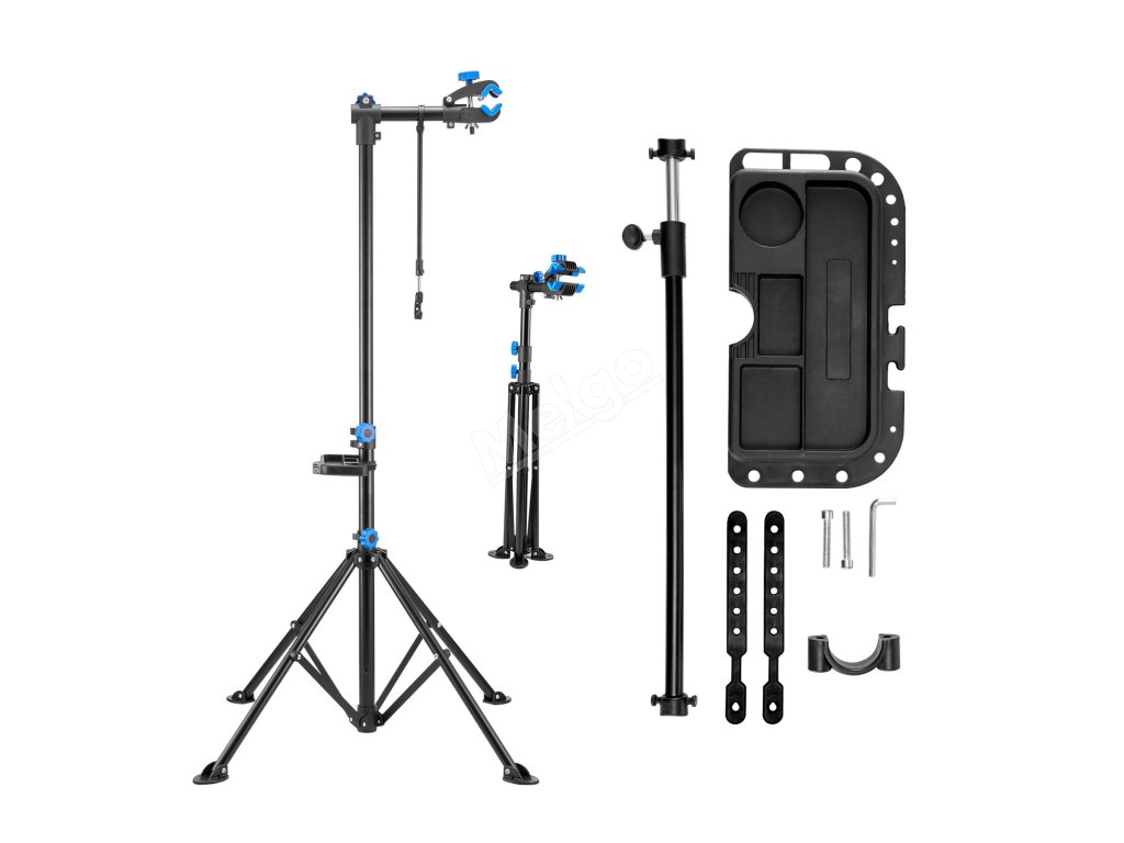 Stojan na údržbu jízdních kol je vybaven různým příslušenstvím, má nastavitelnou tyč na řídítka, která udržuje přední kolo ve stabilní poloze, magnetický zásobník pro rychlé uspořádání nářadí a konstrukci se čtyřmi nohami pro stabilní oporu bez převrácení.