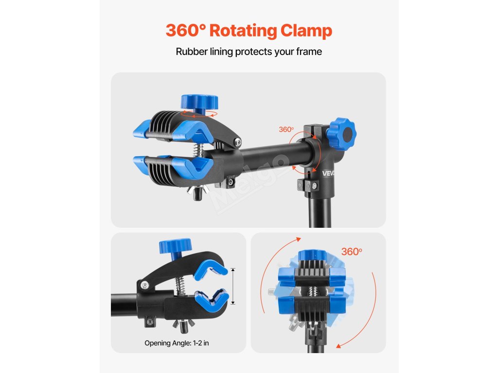 Pracovní stojan na kolo je vybaven nastavitelnou svorkou s měkkou gumovou výstelkou, která bezpečně drží trubky kol různých průměrů. Robustní materiály jsou navrženy tak, aby odolávaly rozbití a deformaci.