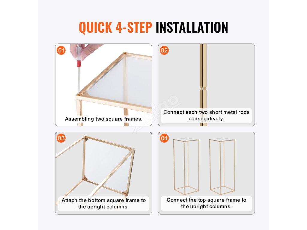 Instalace bez použití nářadí, bez nutnosti použití dalších nástrojů nebo odborných dovedností, je proces stavby svatebních stojanů na květiny rychlejší a pohodlnější, bez nutnosti zdlouhavé a pracné montáže, což šetří čas a úsilí.