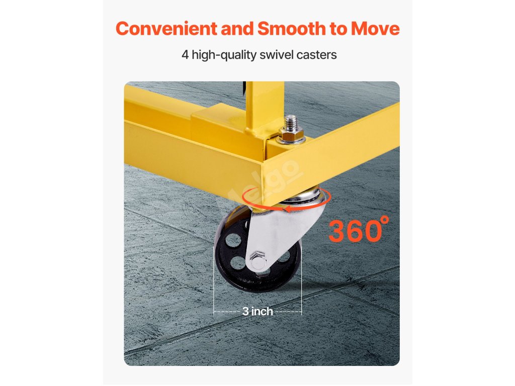 Motorový stojan je vybaven čtyřmi 3palcovými kvalitními otočnými kolečky, která usnadňují jeho přemísťování. Konstrukce bez brzd umožňuje rychlé nastavení polohy, což zvyšuje efektivitu práce.