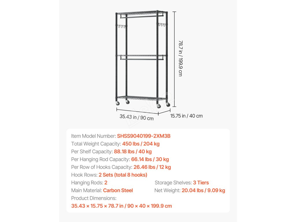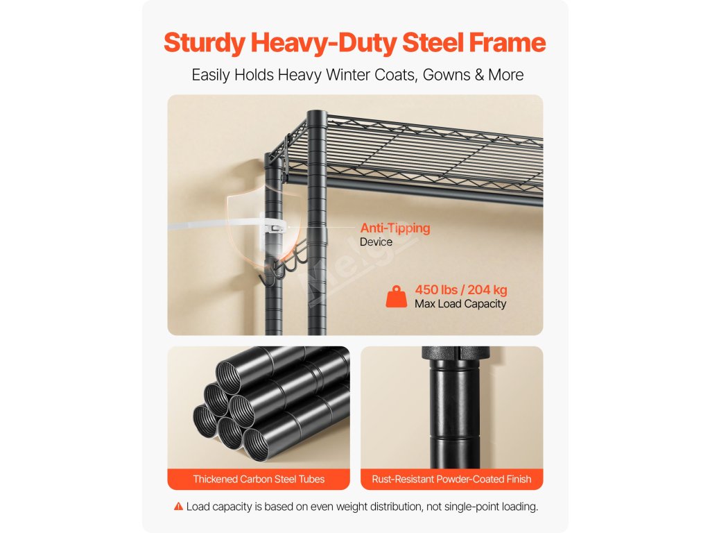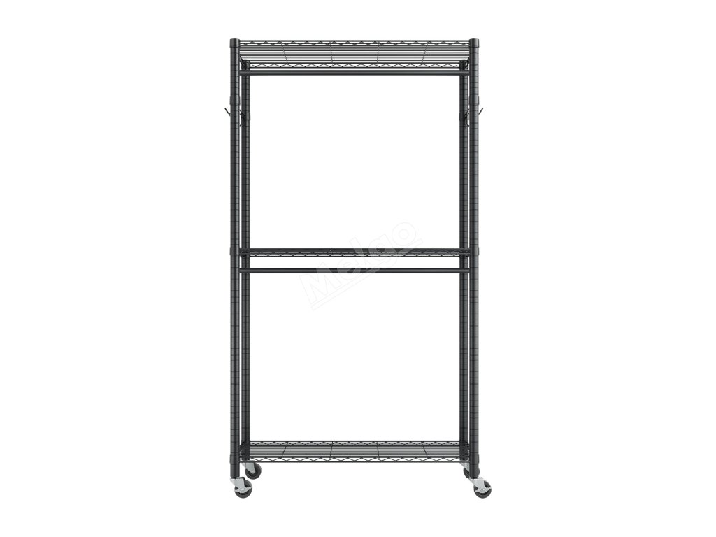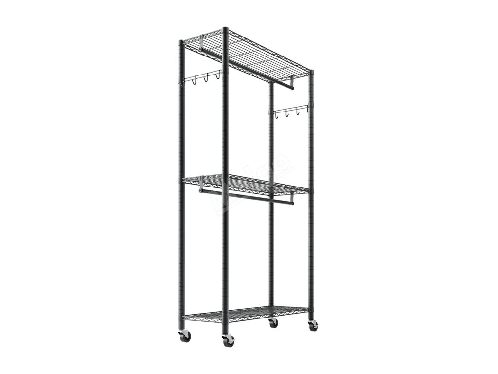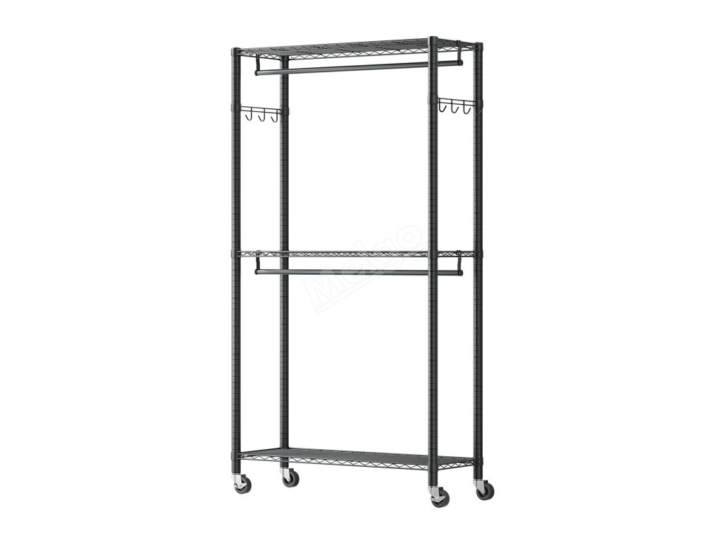 Je vyroben ze zesílené uhlíkové oceli, která zajišťuje pevnost a odolnost, a má práškovou povrchovou úpravu, která odolává korozi a rzi. Robustní konstrukce zajišťuje, že každá police, závěsná tyč a háček snadno zvládnou váhu každodenního oblečení a předmětů a poskytují spolehlivou oporu a klid.