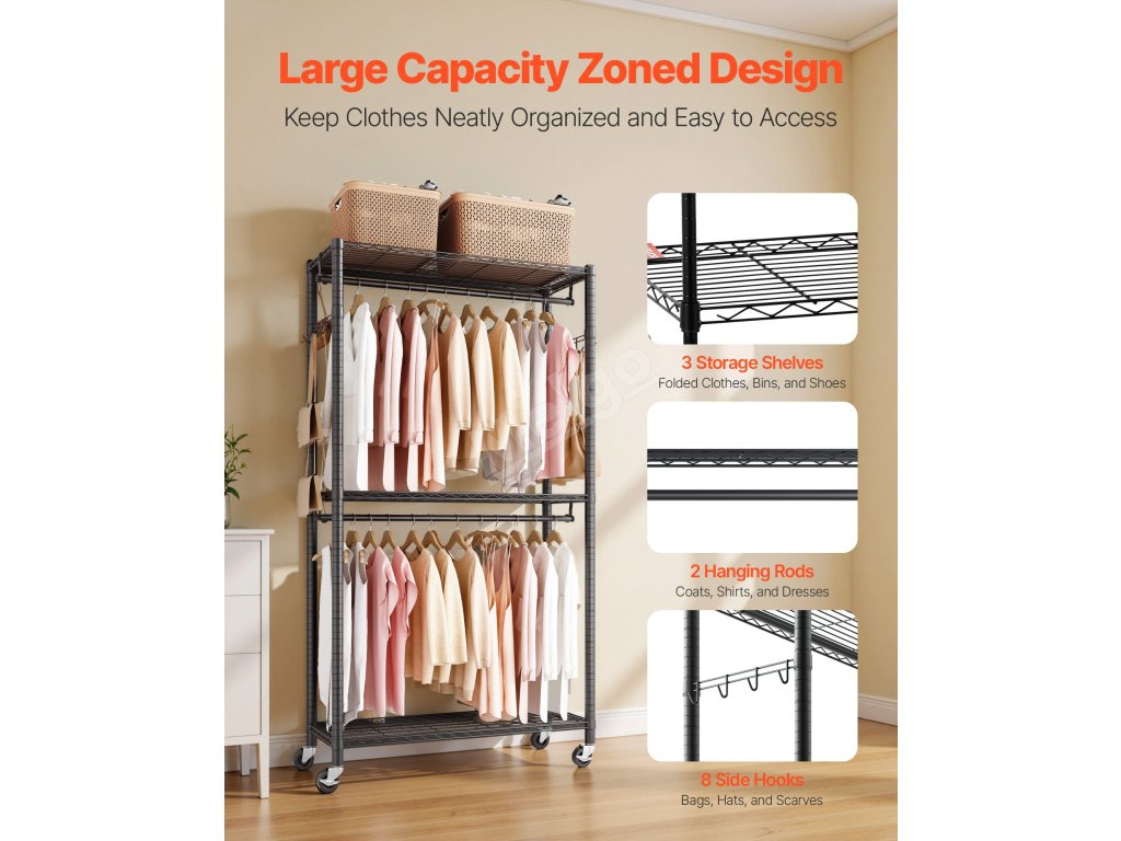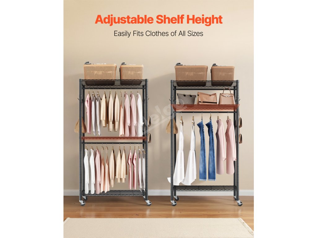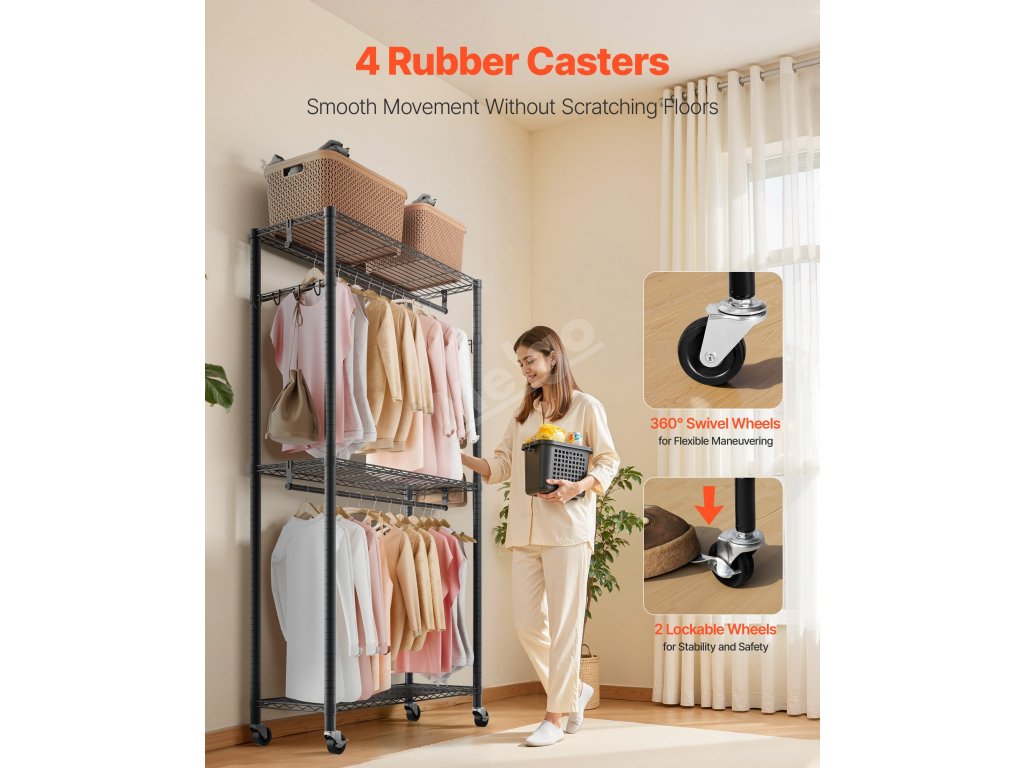 Tento pojízdný věšák na oblečení poskytuje dostatek úložného prostoru a je vyroben z odolné uhlíkové oceli, která zajišťuje pevnost a trvanlivost.Kolečka o 360° umožňují snadnou mobilitu. Do nastavitelných polic se vejdou oděvy a předměty různých velikostí, takže ukládání je bezproblémové a pohodlné.