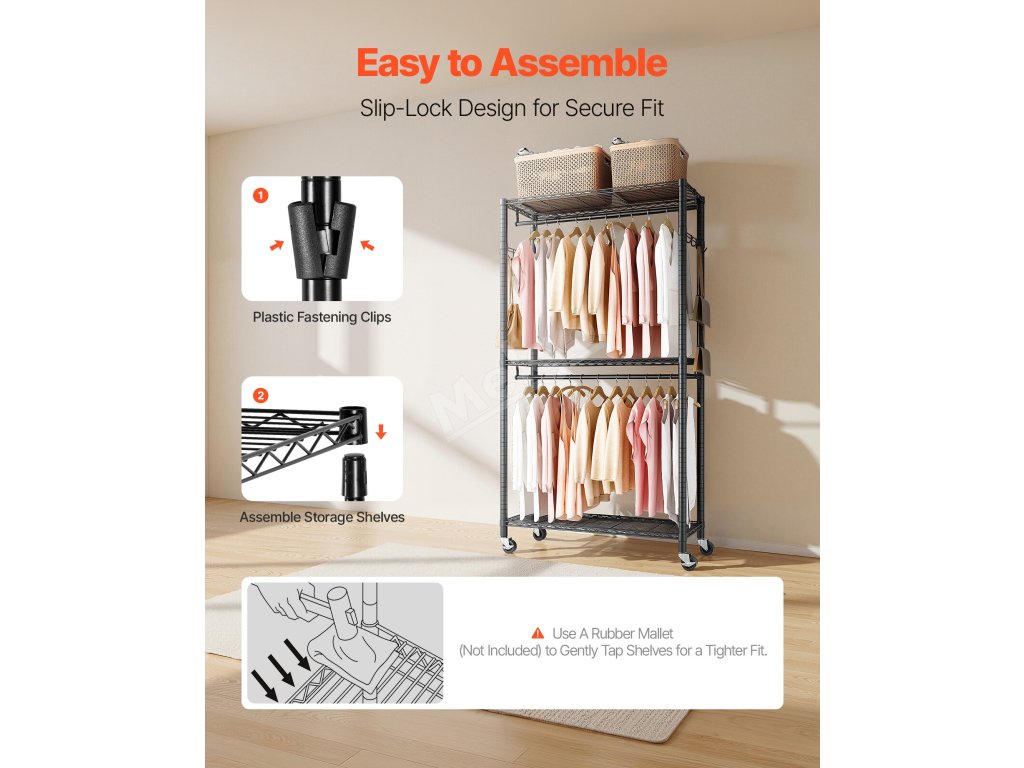 Tento závěsný věšák na oděvy je navržen pro pohodlné používání a lze jej snadno a rychle sestavit bez použití nářadí nebo speciálních dovedností. Plastové klipy a zatahovací konektory zajišťují bezpečné nastavení v několika snadných krocích, takže si můžete ihned užívat efektivní skladování.