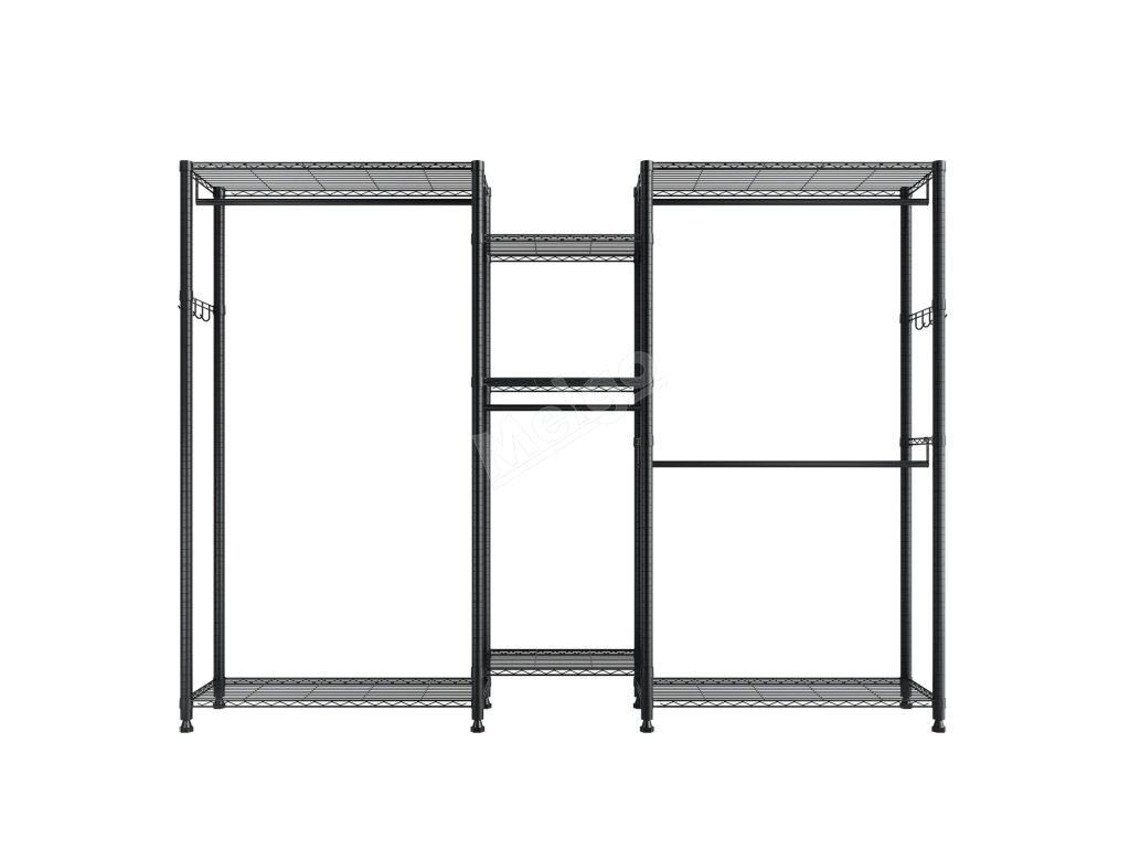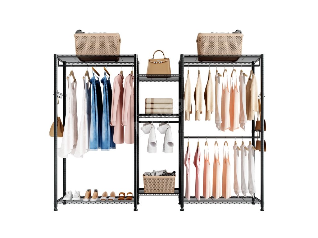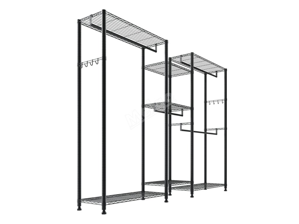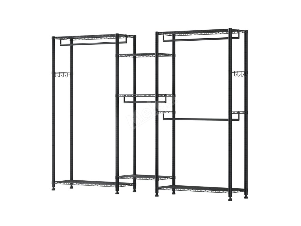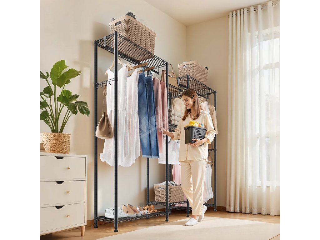 Je vyroben ze zesílené uhlíkové oceli, která zajišťuje pevnost a odolnost, a má práškovou povrchovou úpravu, která odolává korozi a rzi. Robustní konstrukce zajišťuje, že každá police, závěsná tyč a háček snadno zvládnou váhu každodenního oblečení a předmětů a poskytují spolehlivou oporu a klid.