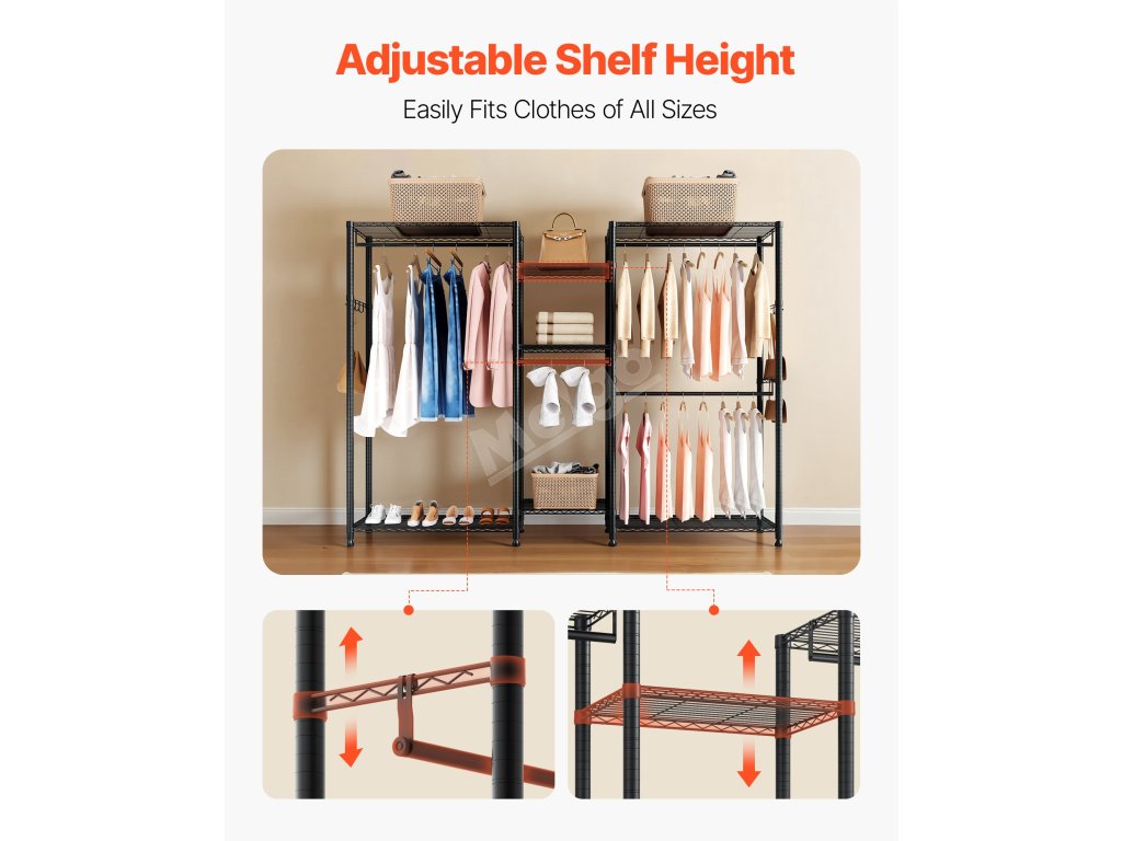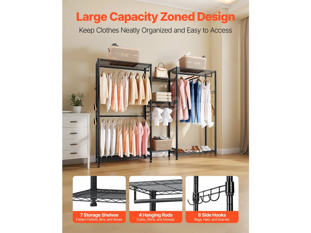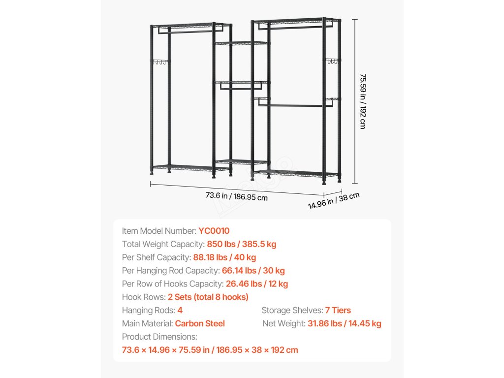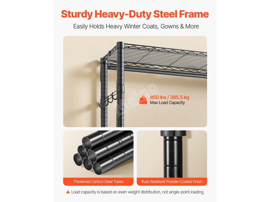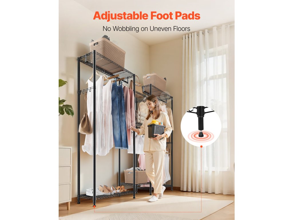 Je vyroben ze zesílené uhlíkové oceli, která zajišťuje pevnost a odolnost, a má práškovou povrchovou úpravu, která odolává korozi a rzi. Robustní konstrukce zajišťuje, že každá police, závěsná tyč a háček snadno zvládnou váhu každodenního oblečení a předmětů a poskytují spolehlivou oporu a klid.