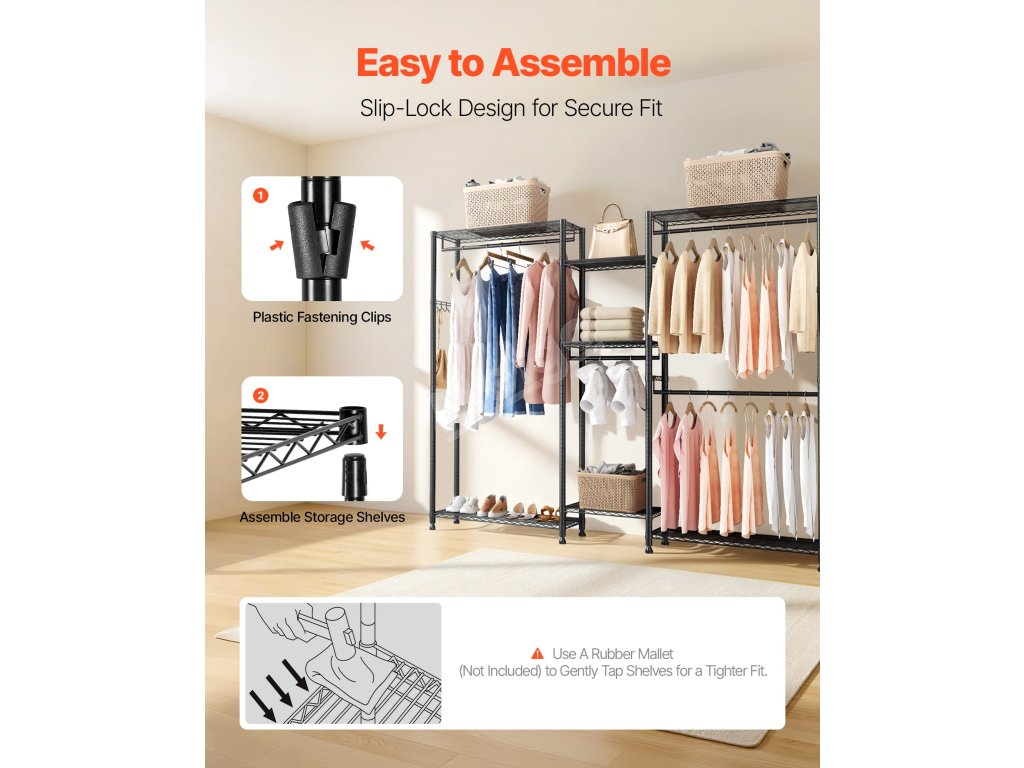 Tento závěsný věšák na oděvy je navržen pro pohodlné používání a lze jej snadno a rychle sestavit bez použití nářadí nebo speciálních dovedností. Plastové klipy a zatahovací konektory zajišťují bezpečné nastavení v několika snadných krocích, takže si můžete ihned užívat efektivní skladování.