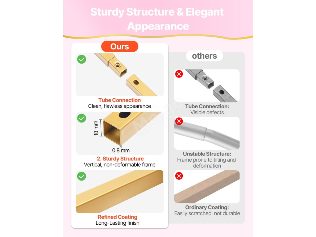 Náš kovový obloukový stojan na pozadí s kovovými čtvercovými trubkami o rozměrech 0,71 x 0,71 palce/18 x 18 mm je odolný proti korozi a neohýbá se, což zaručuje dlouhou životnost. Díky zesílené svařované základně zvyšuje stabilitu. Přidává také krytku nohou, která je krásná a prachotěsná, vhodná pro vnitřní i venkovní použití.
