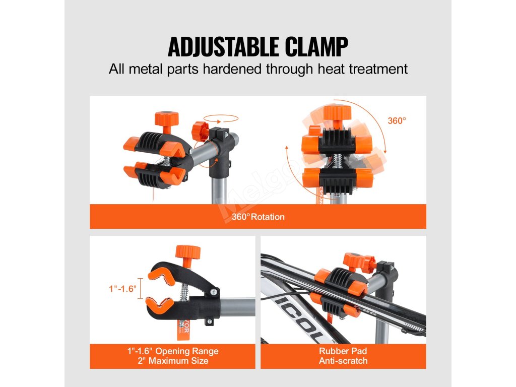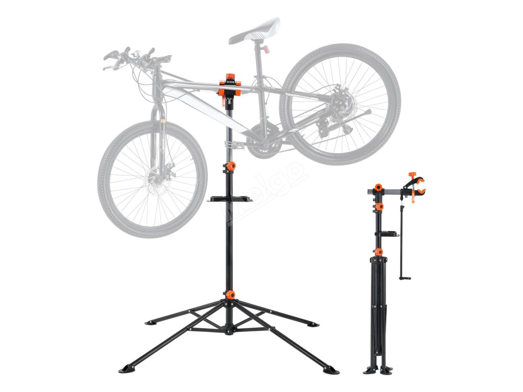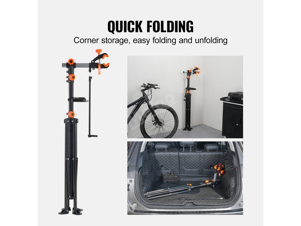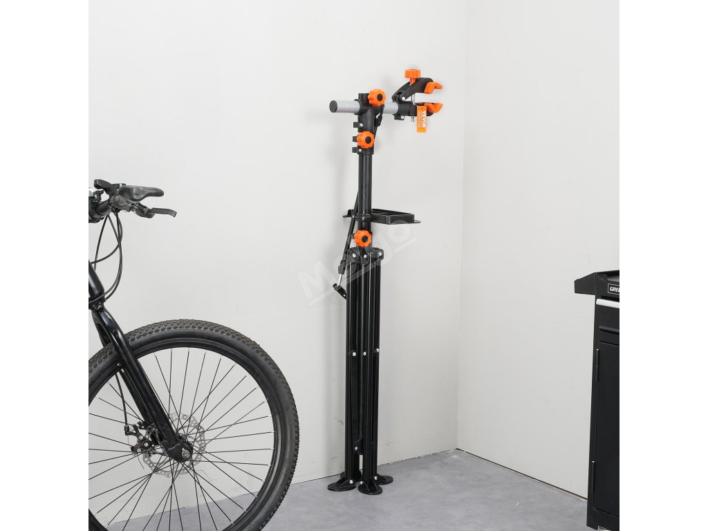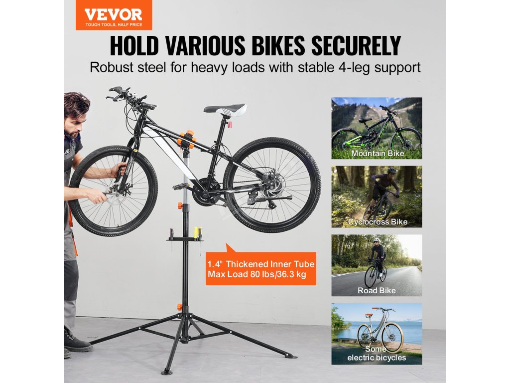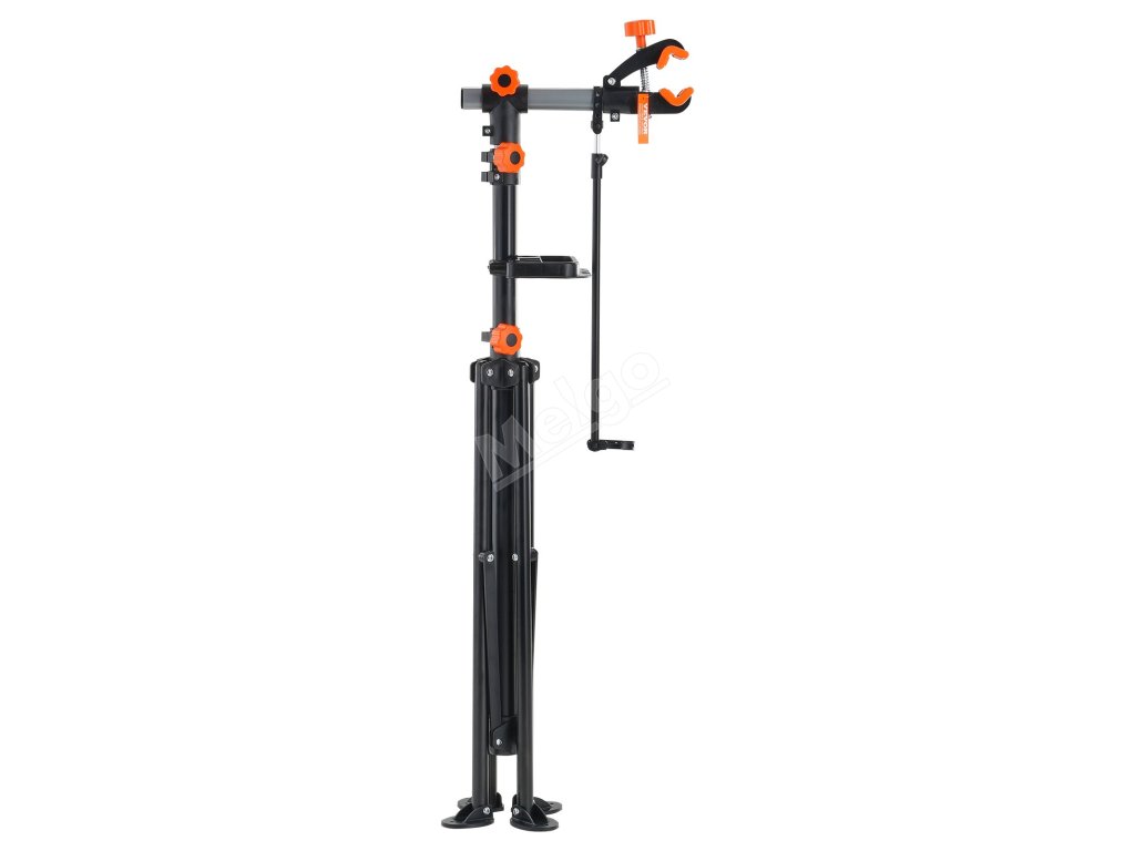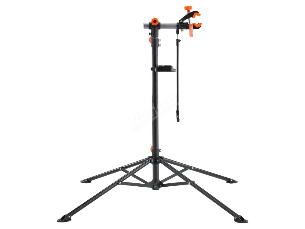 Tento pracovní stojan na kola je navržen pro těžká břemena, jeho nosnost je 80 kg. Pojme širokou škálu jízdních kol včetně horských kol, terénních kol a většiny elektrokol. Čtyřnohá protiskluzová konstrukce základny poskytuje stabilní oporu bez nežádoucích otřesů.