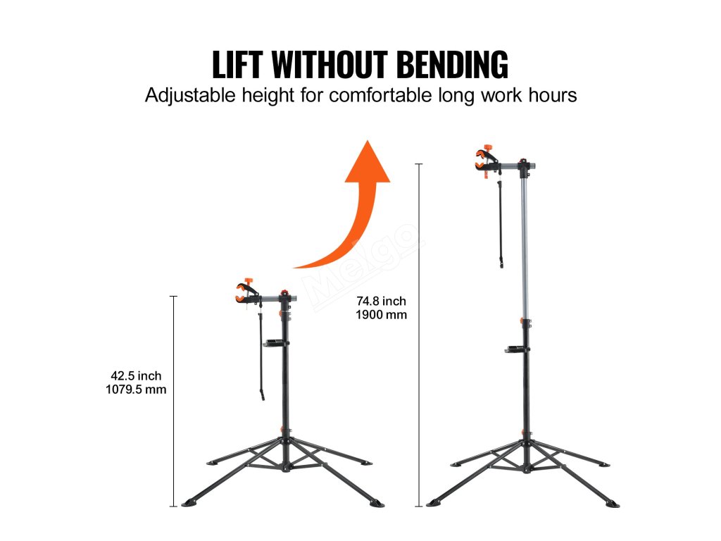 Náš stojan na opravu kol je navržen tak, aby vám usnadnil a urychlil práci. Díky rozsahu nastavení výšky 42,5"-74,8" můžete pohodlně pracovat v preferované výšce, ať už vsedě nebo vestoje. Svorka otočná o 360° vám umožní nastavit kolo do ideálního úhlu podle vašich potřeb.
