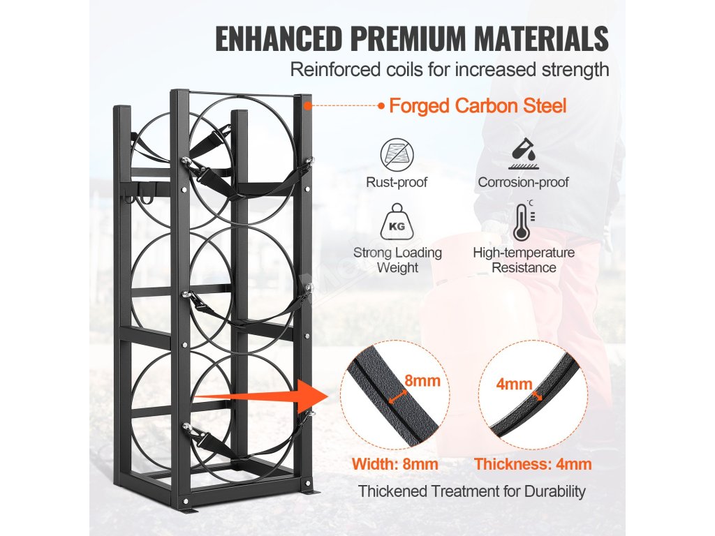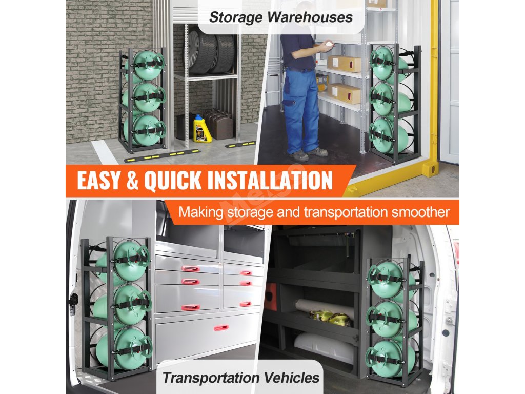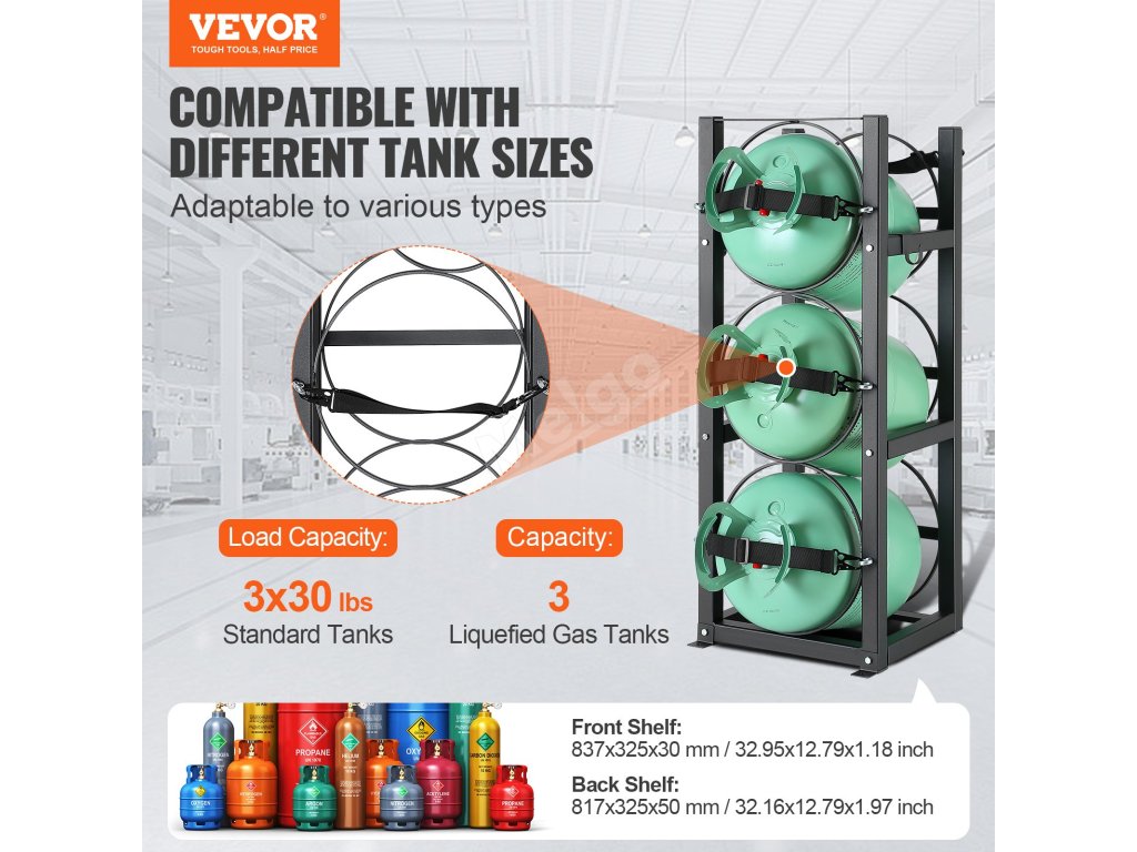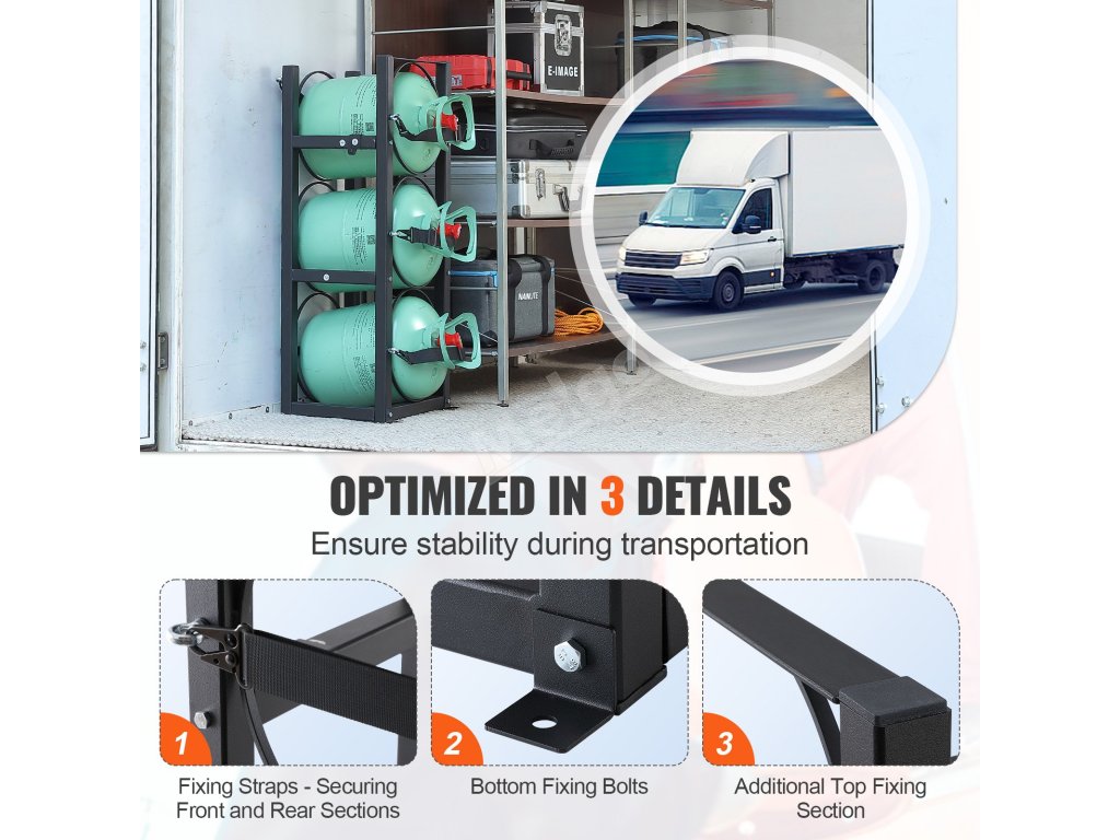 Pro zlepšení stability a kompatibility s různými velikostmi nádrží je tento stojan na láhve s chladicí kapalinou vybaven nastavitelnými montážními popruhy a spodními šrouby. Pojme 2x30 lbs (13,6 kg) nádrže a 3 další malé láhve s nádržemi. Bezpečně uložte nádrže a zároveň maximalizujte využití prostoru.