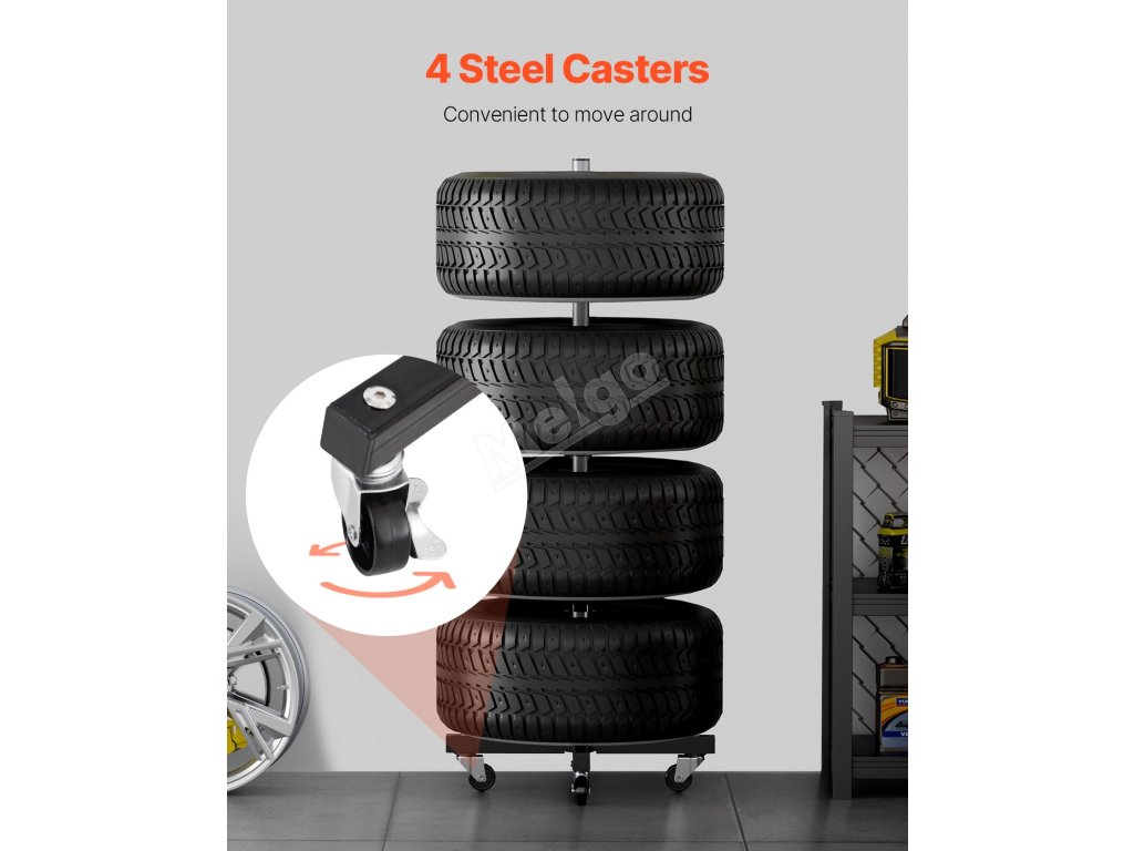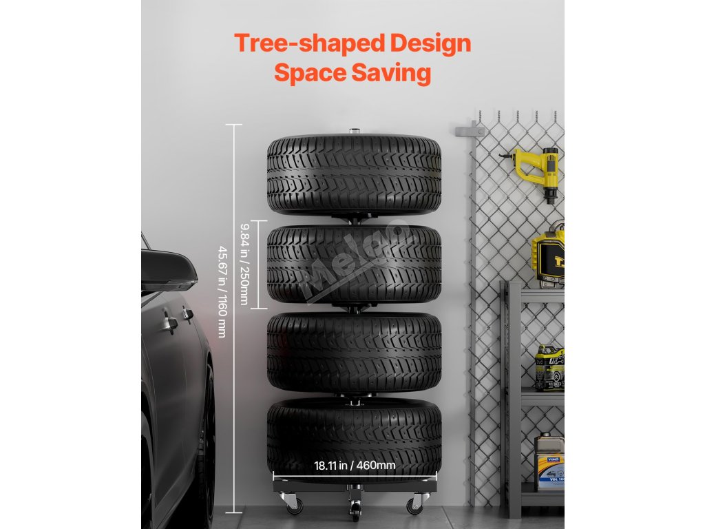 Tento stojan na pneumatiky je vybaven 4 robustními ocelovými kolečky a umožňuje bezproblémovou přepravu pneumatik do garáže. Mobilní stojan na pneumatiky s kompaktní základnou o rozměrech 18,11'' x 18,11'' a designem ve tvaru stromu šetří místo tím, že se úhledně vejde do rohu.