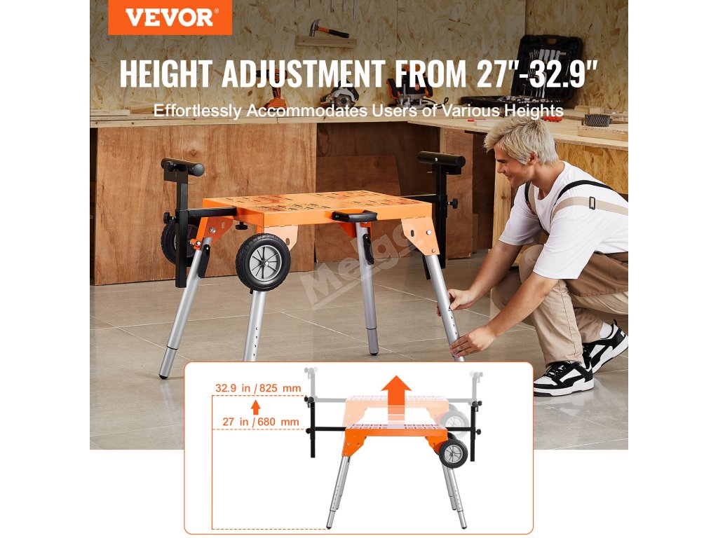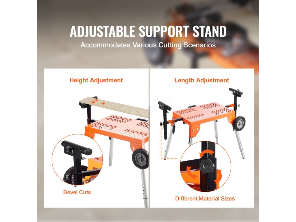 Uživatelé s různou výškou si mohou najít pohodlnou pracovní polohu. Tento stojan na pokosovou pilu lze nastavit tak, aby se snížila únava z nadměrného ohýbání nebo natahování, a to od vysokých profesionálů až po drobné kutily.