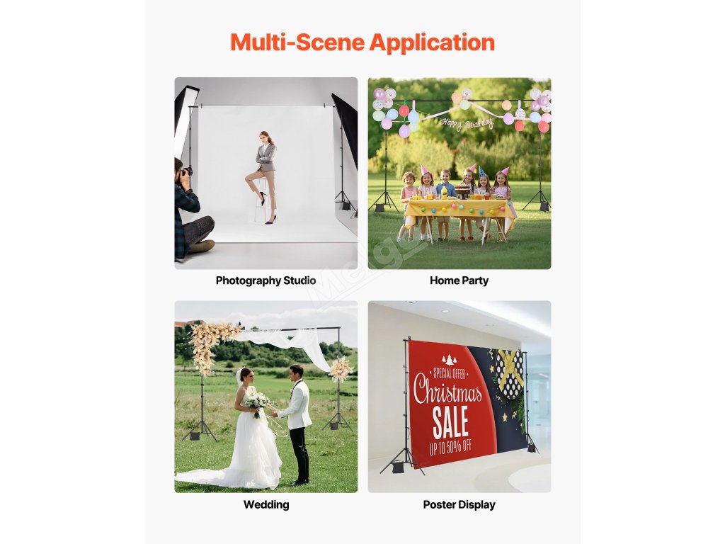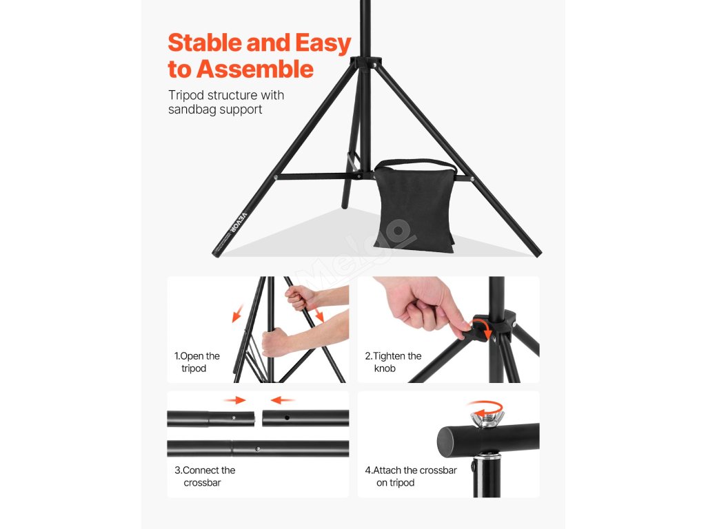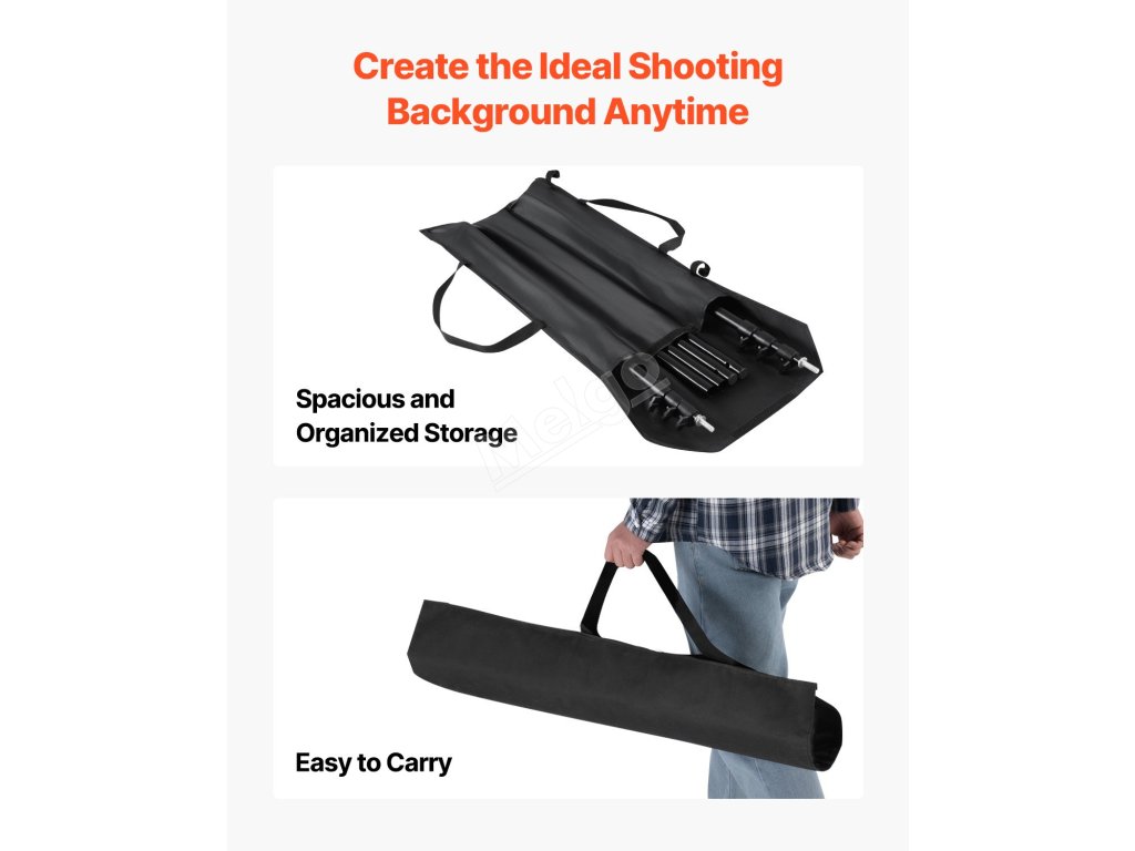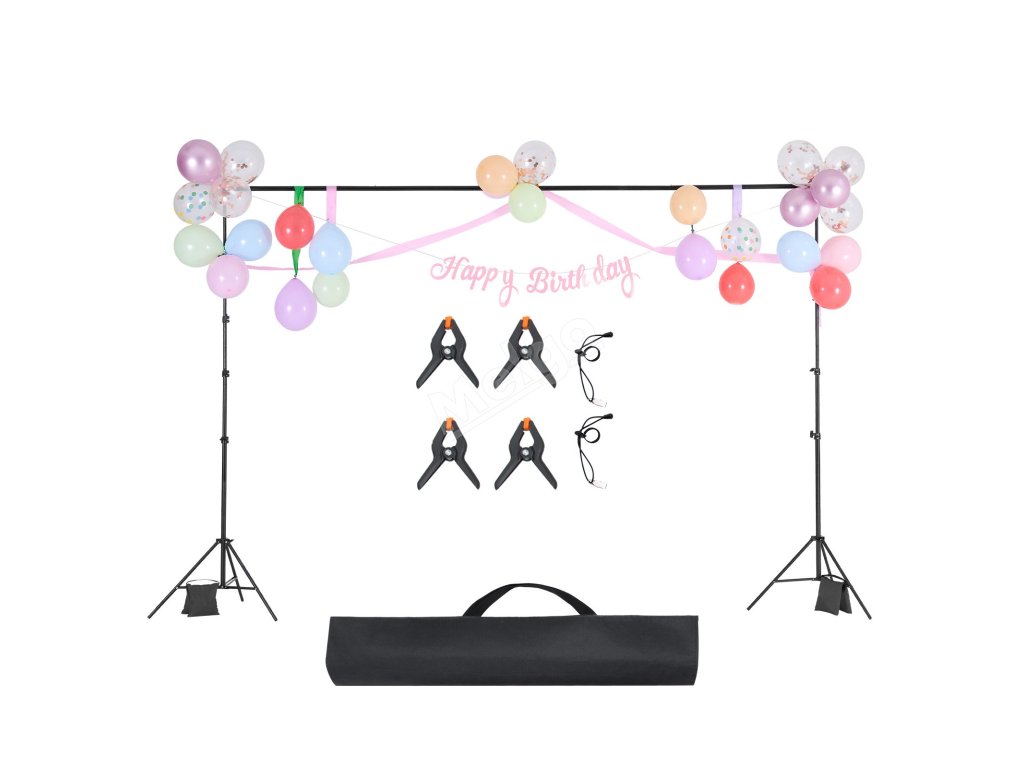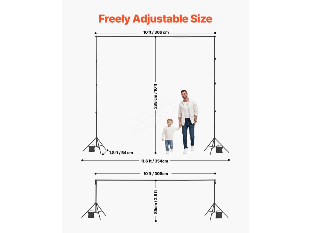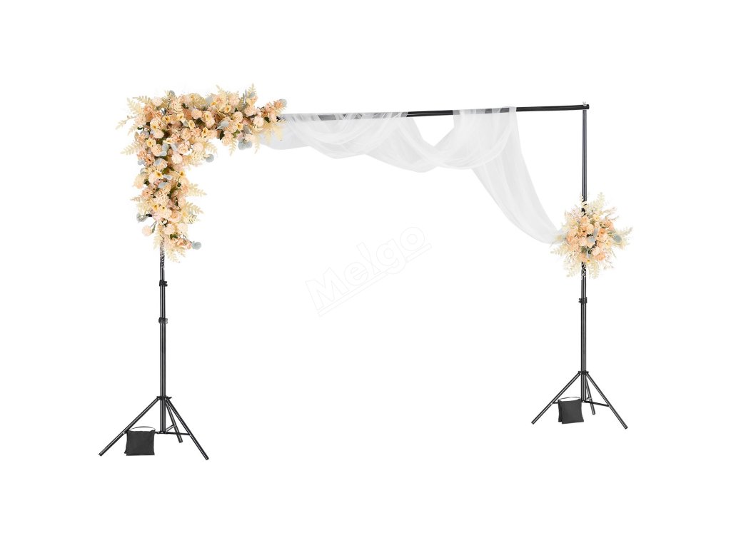 Tento stojan na pozadí je vybaven 2 stativovými podpěrami pro zajištění stability a odolnosti a má nosnost 10 kg. Jeho nastavitelná velikost je vhodná pro velká pozadí a je ideální pro studia, domácí použití, hotely a jeviště.