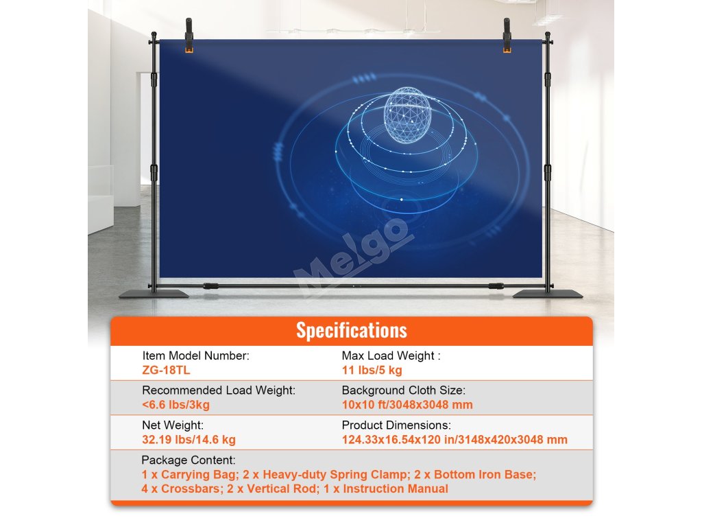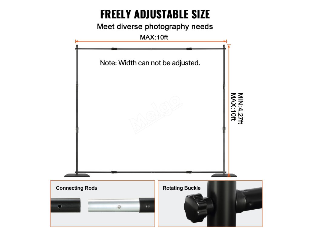 Tento stojan na pozadí má základnu z uhlíkové oceli, která zajišťuje výjimečnou stabilitu a odolnost, a unese maximální hmotnost 11 kg. Díky nastavitelným rozměrům je ideální pro různé druhy pozadí, které vyhovují vašim potřebám na svatbách, v profesionálních studiích, při domácích instalacích, v hotelech nebo na pódiích.