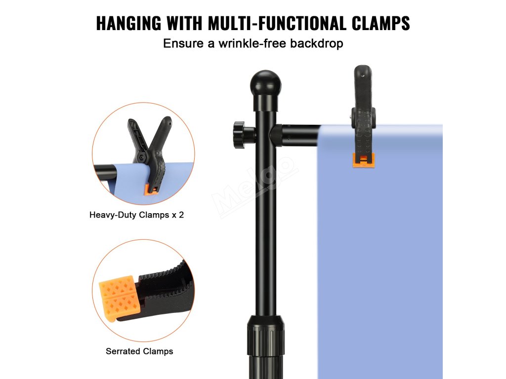 Náš odolný stojan na pozadí je vybaven dvěma silnými svorkami. Ty jsou navrženy tak, aby k rámu bezpečně připevnily cokoli a pomohly vám pevně a bez pomačkání upevnit látku pozadí.