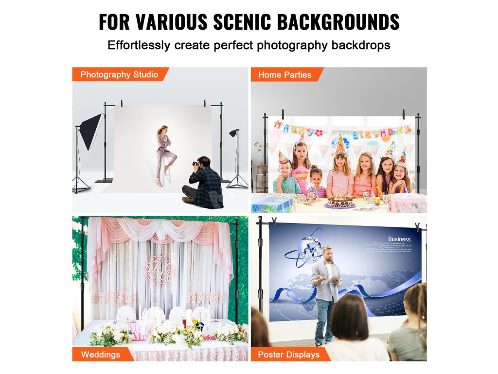 Ať už potřebujete profesionální studiové pozadí, pozadí pro vystavení produktu, DIY fotobudku, svatební nebo párty výzdobu, náš stojan na trubky a závěsy splní vaše požadavky.
