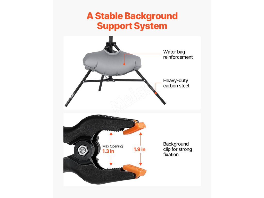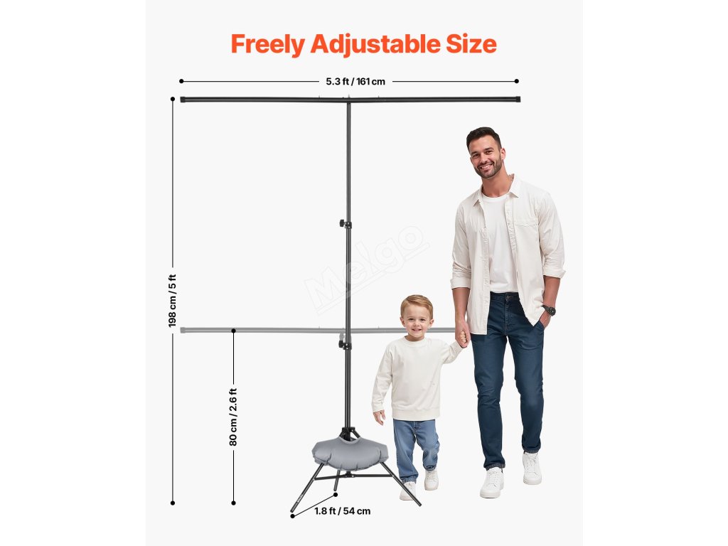 Náš nastavitelný stojan na pozadí nabízí několik možností nastavení velikosti. Podpěrné tyče se mohou rozšířit z minimální výšky 2,6 stopy/80 cm na maximální výšku 6,5 stopy/198 cm, aby se přizpůsobily různým velikostem pozadí.