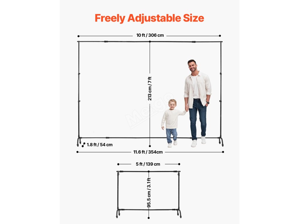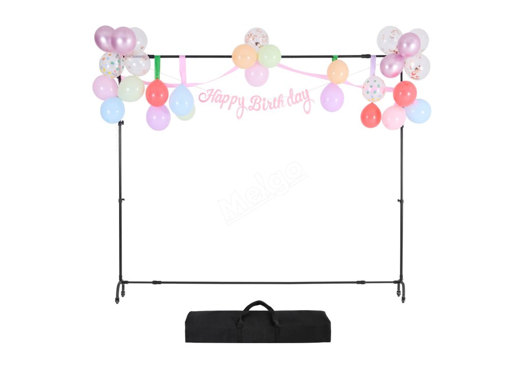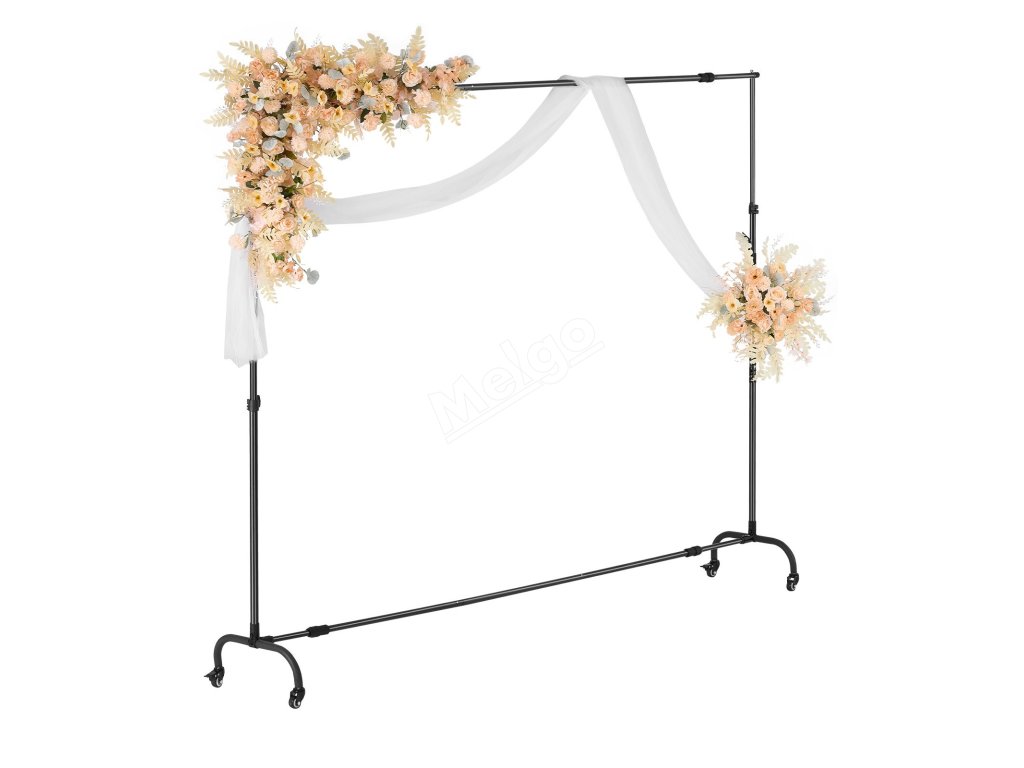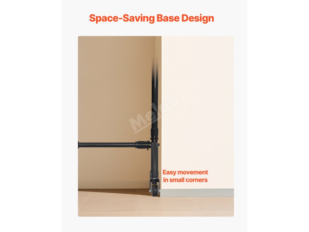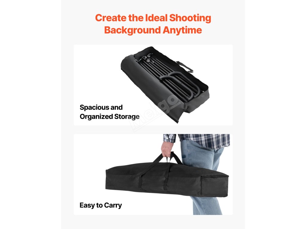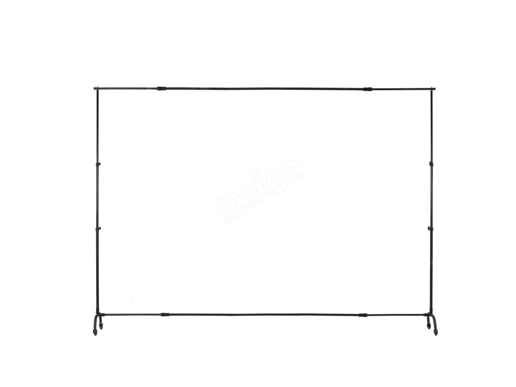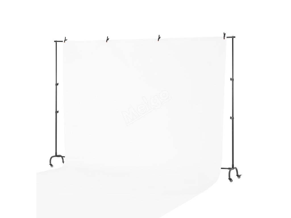 Tento stojan na pozadí má pohyblivou základnu a vodorovnou tyč pro větší stabilitu. Jeho nastavitelná velikost je vhodná pro velká pozadí a je ideální pro studia, domácí použití, hotely a jeviště.