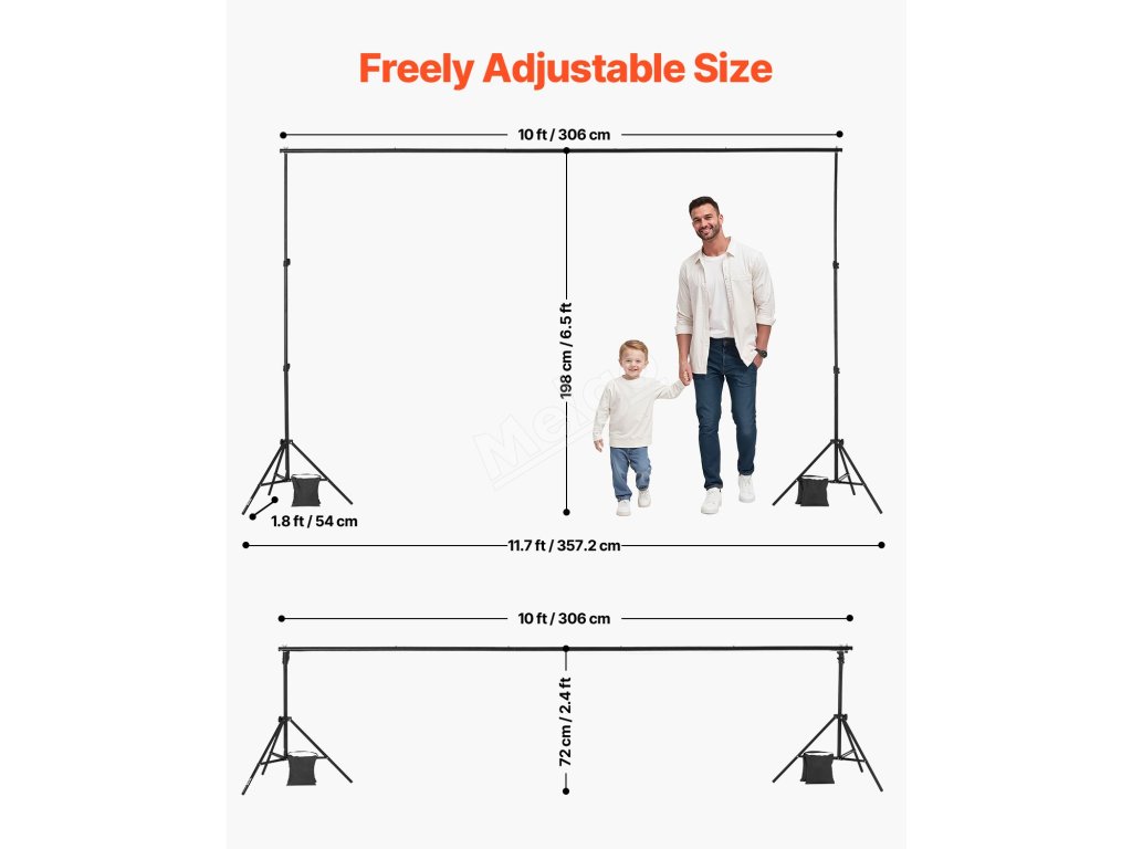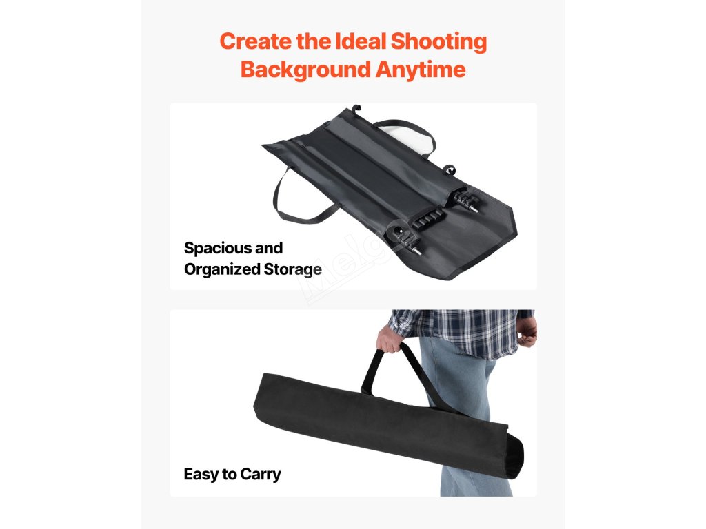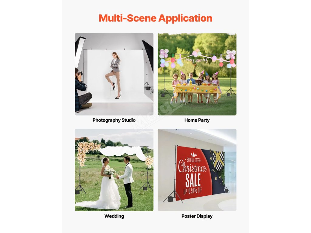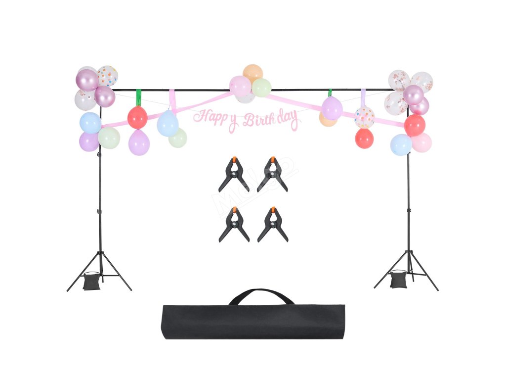 Tento stojan na pozadí je vybaven 2 stativovými podpěrami pro zajištění stability a odolnosti a má nosnost 10 kg. Jeho nastavitelná velikost je vhodná pro velká pozadí a je ideální pro studia, domácí použití, hotely a jeviště.