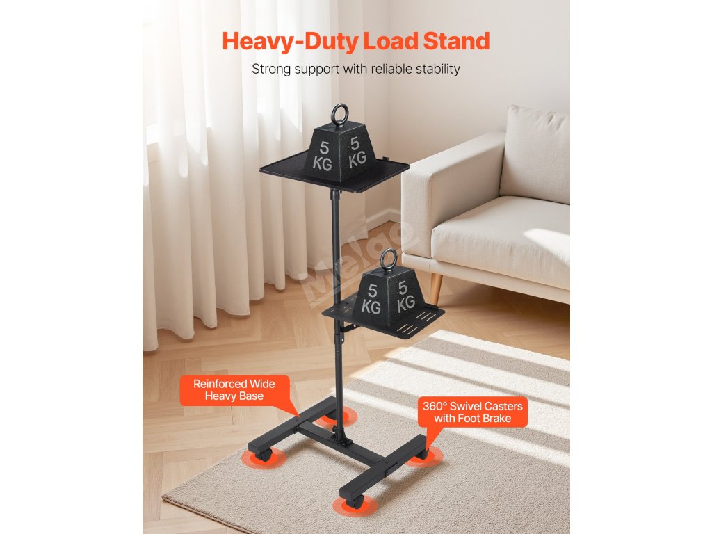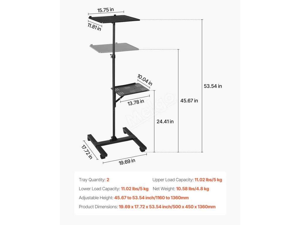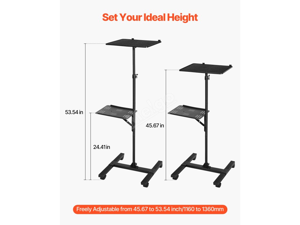 Náš stojan na projektor je vyroben z uhlíkové oceli a železné základny a nabízí stabilní oporu. Zásobník z ABS minimalizuje otřesy a tyč lze prodloužit od 33,86 do 53,54 palce. Je vybaven popruhy a dvěma policemi, takže se na něj vejde více zařízení, a základna ve tvaru písmene I s kolečky usnadňuje jeho přemisťování.