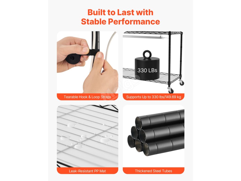 Nastavitelné police jsou vhodné pro rostliny různých výšek. popruhy s háčky a smyčkami udržují rostliny v bezpečí, nepropustné PP zásobníky chrání obvody a otočná gumová kolečka umožňují bezproblémové přemisťování.