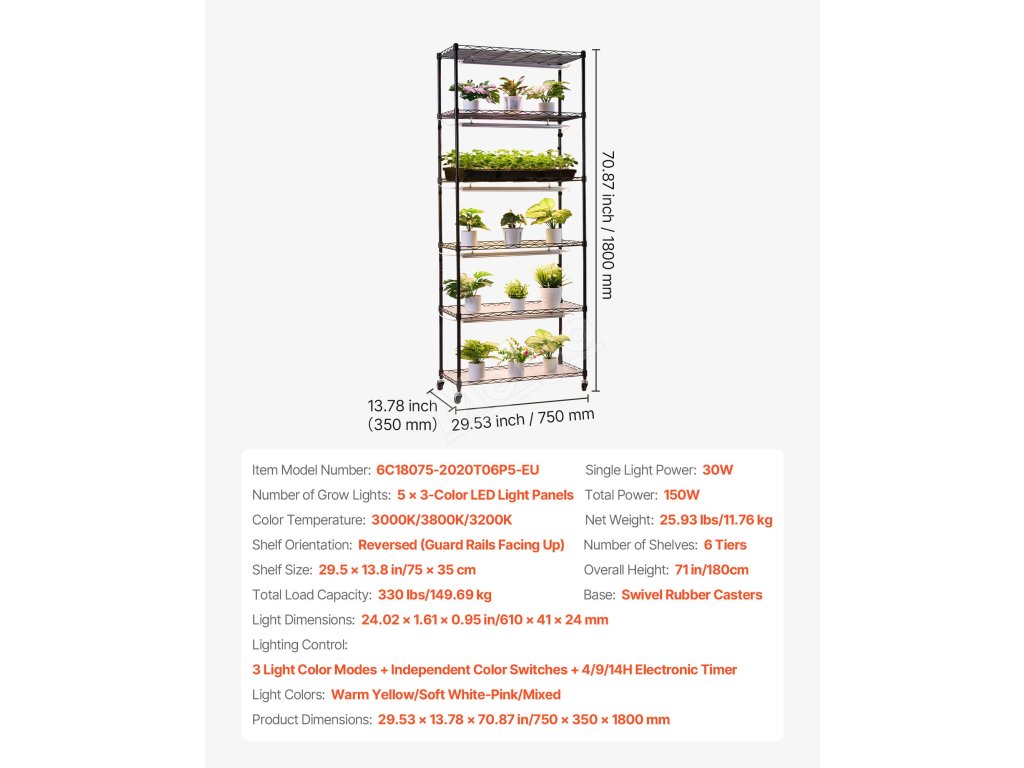 Stojan na rostliny 6 pater 180cm, 150W 3-barevné, časovač 4/9/14H
